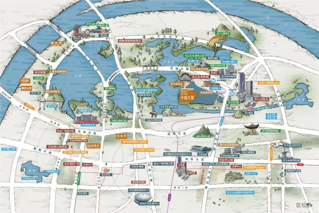武汉半岛九里,沿湖岸向东约9里,正好是花山规划的商业主轴——花山河商业街所在地。
