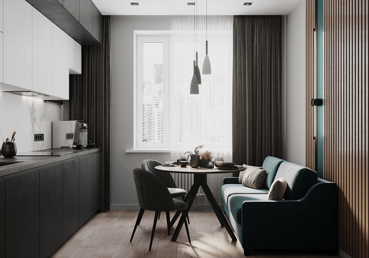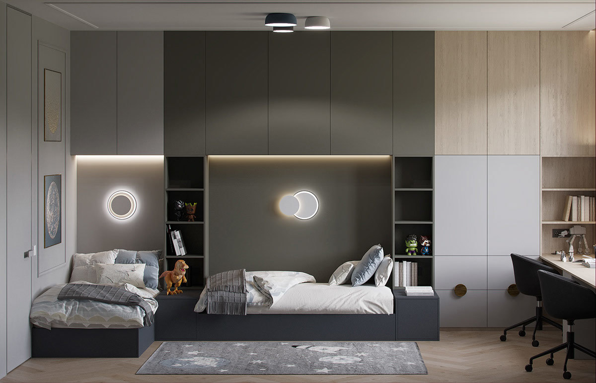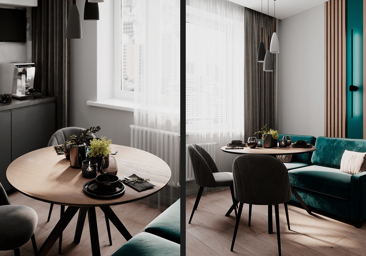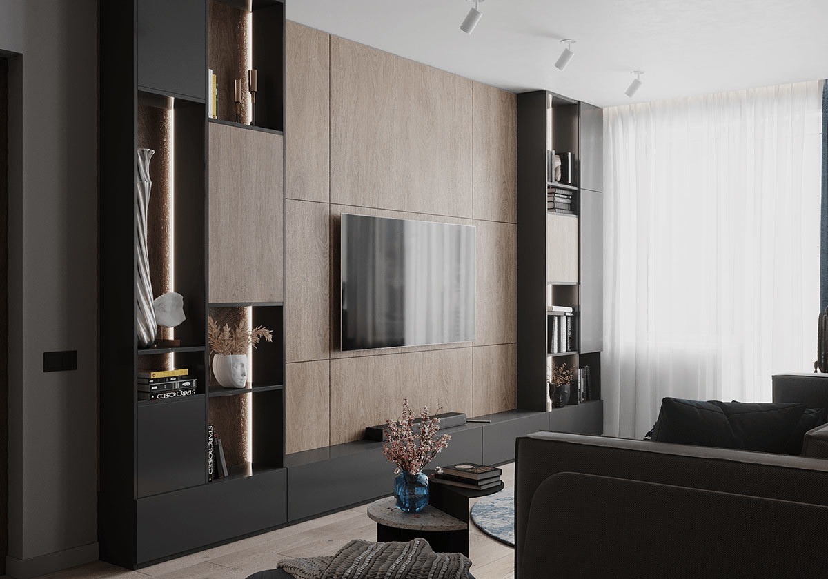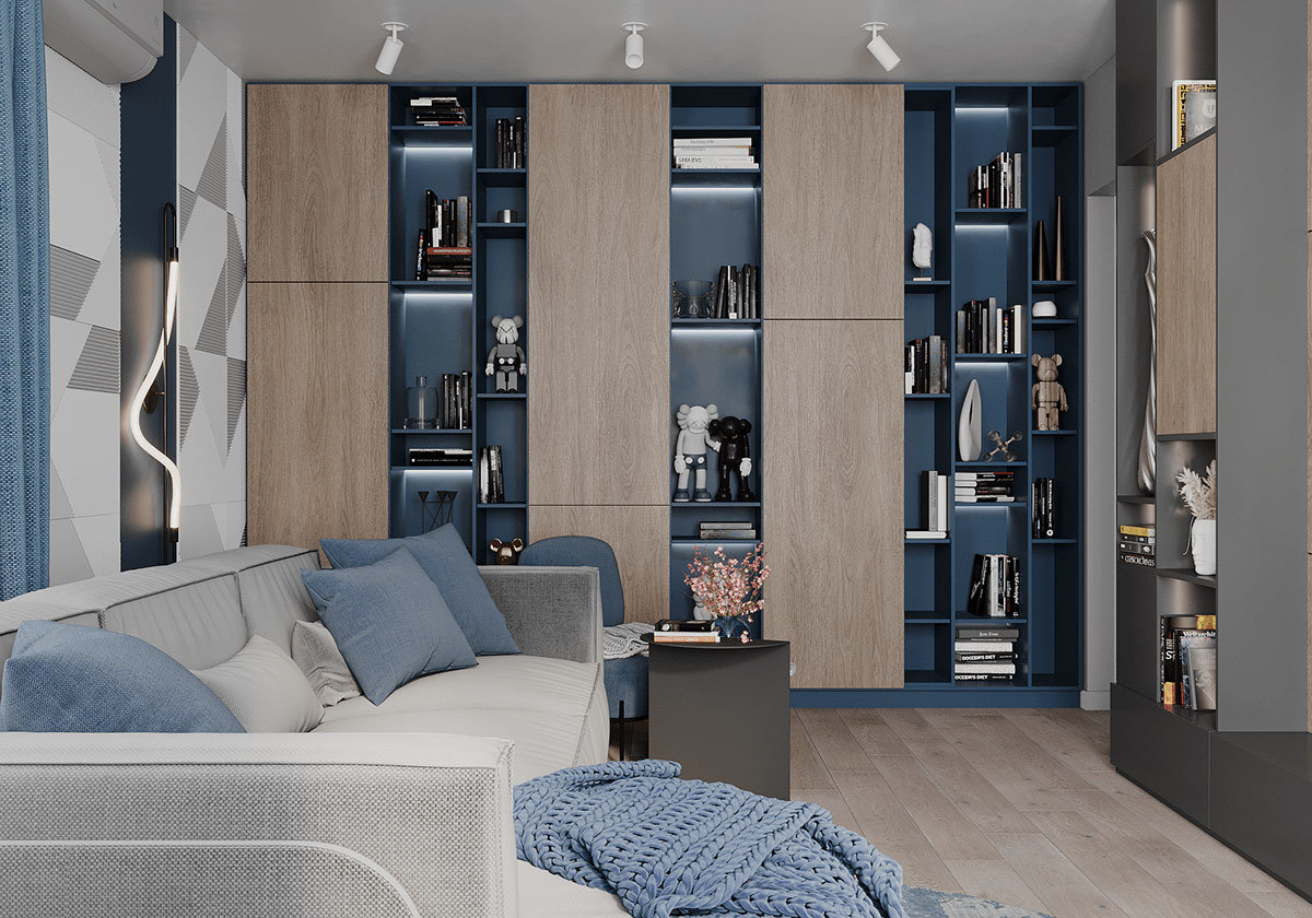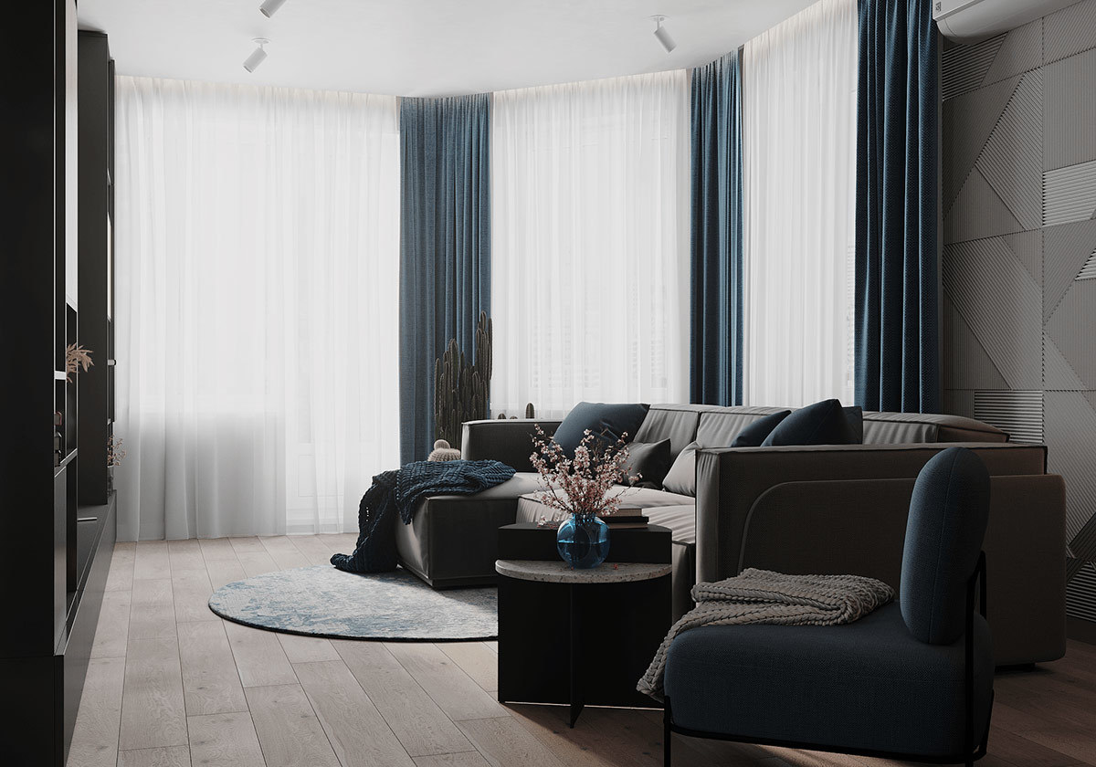 本案选用深蓝色与灰色搭配,使空间极其精致,且这两种深色调搭配一起使空间沉稳低调而又不失高雅。