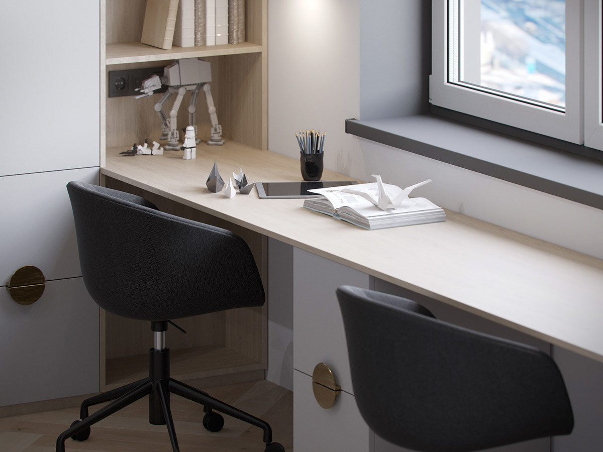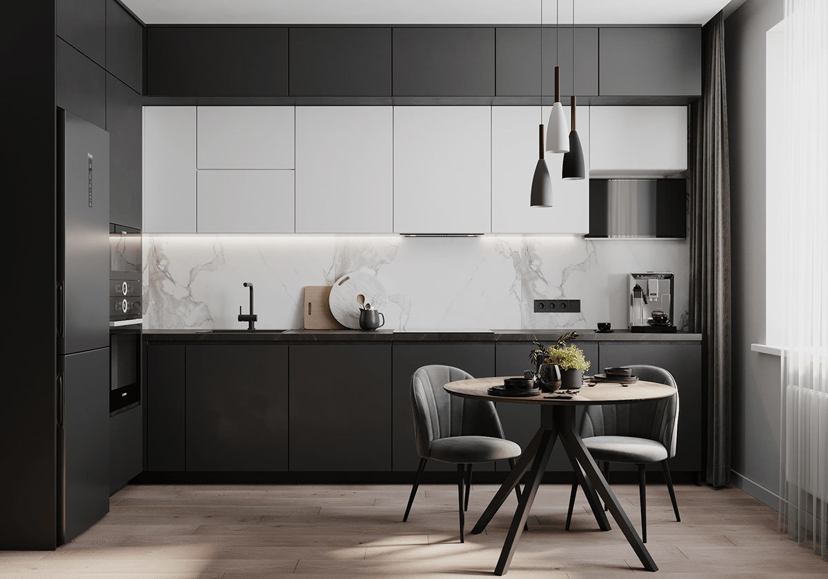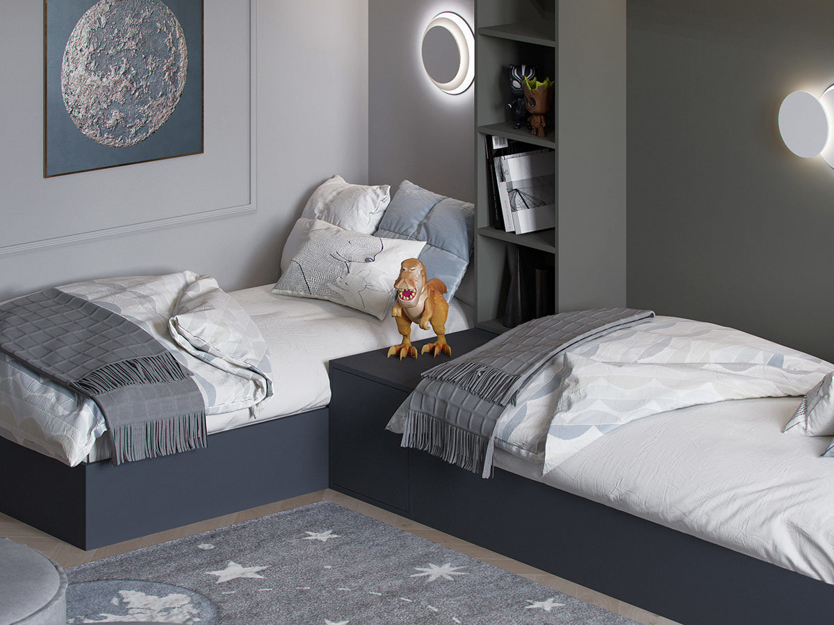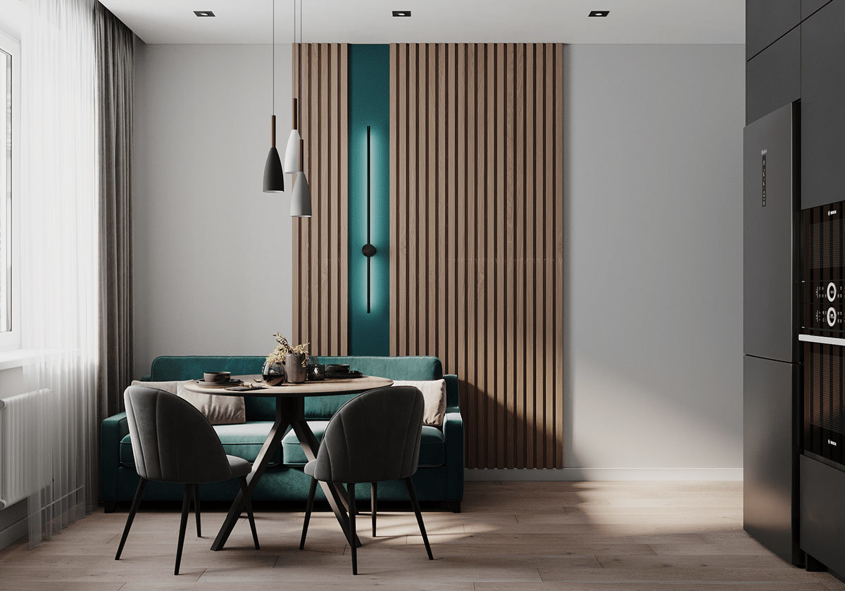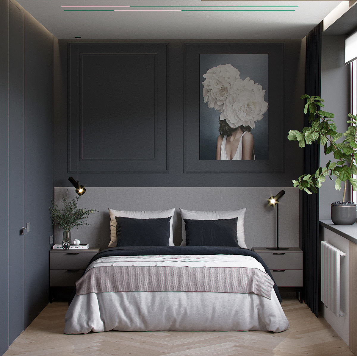 本案选用深蓝色与灰色搭配,使空间极其精致,且这两种深色调搭配一起使空间沉稳低调而又不失高雅。