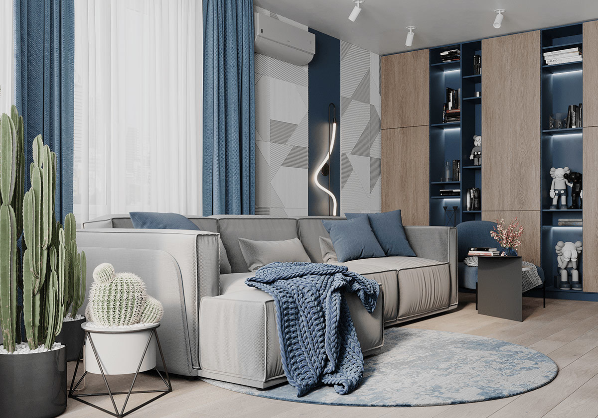 客厅,阳光透过弧形窗洒满客厅每个角落,整个房间的空气流通也非常好,夏天窗户随便开点小缝都能感受到清风吹来。沙发背景墙使用罗纹几何图案面板,中间嵌入蓝色面板做间隔。深蓝色书柜与整体空间相连贯,传达艺术与生活和谐相处的美好愿望。