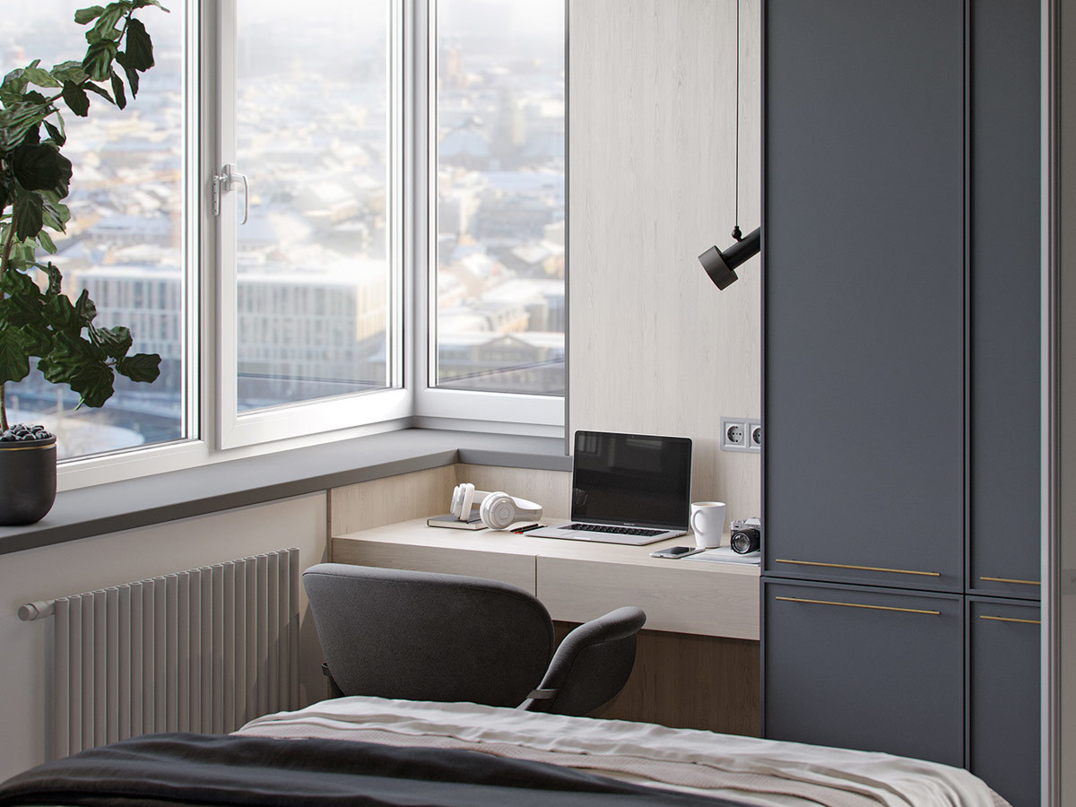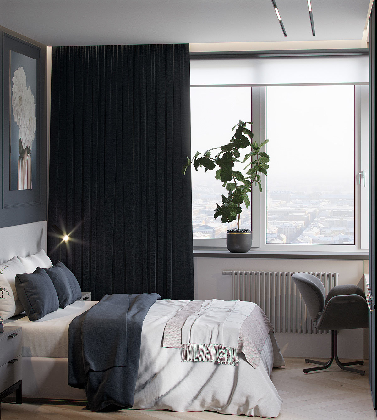 卧室则是深蓝色和白色组成,居家的惬意感油然而生,全屋采光有十足的通透性,厚重的窗帘也可遮挡全屋光线,保证睡眠。