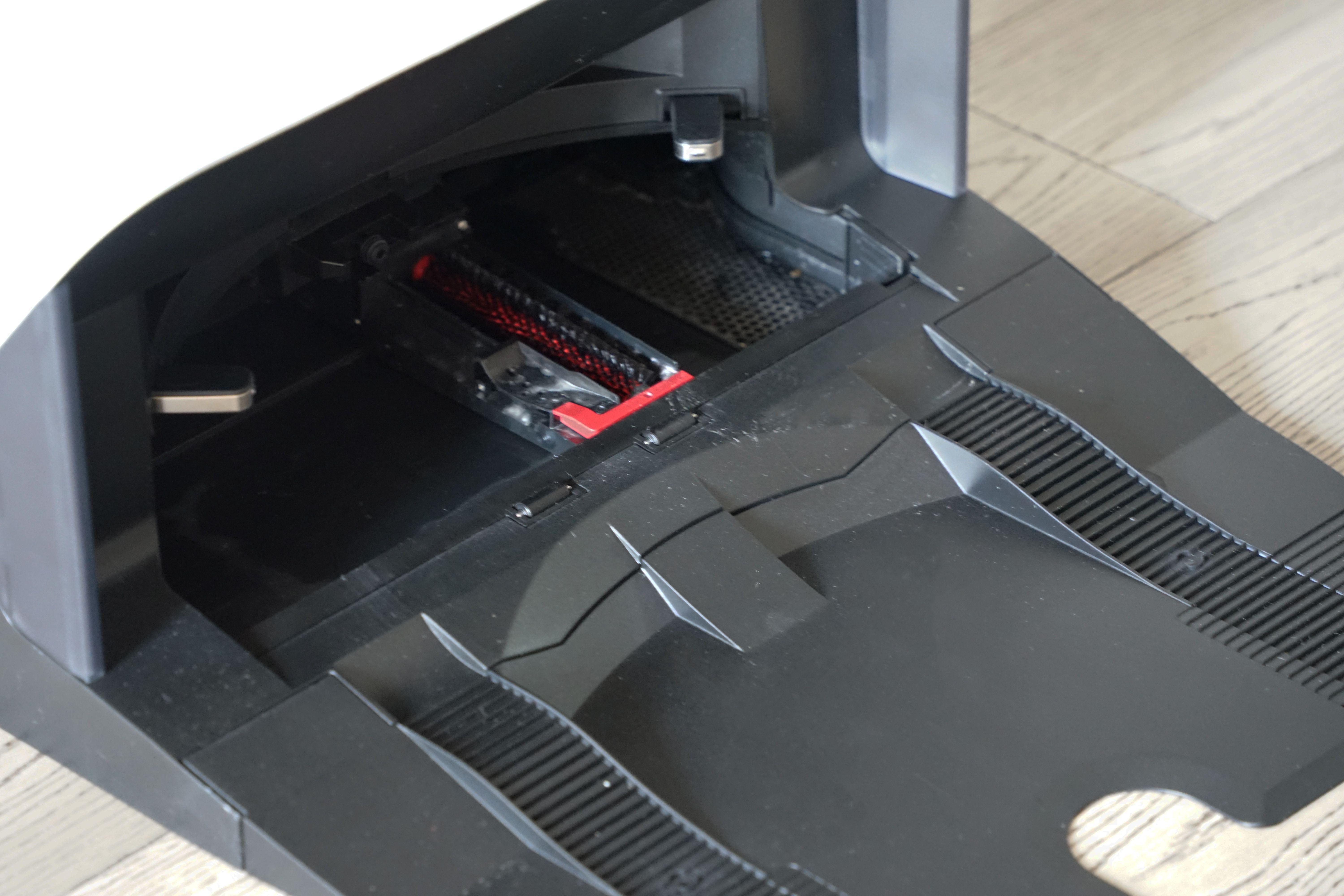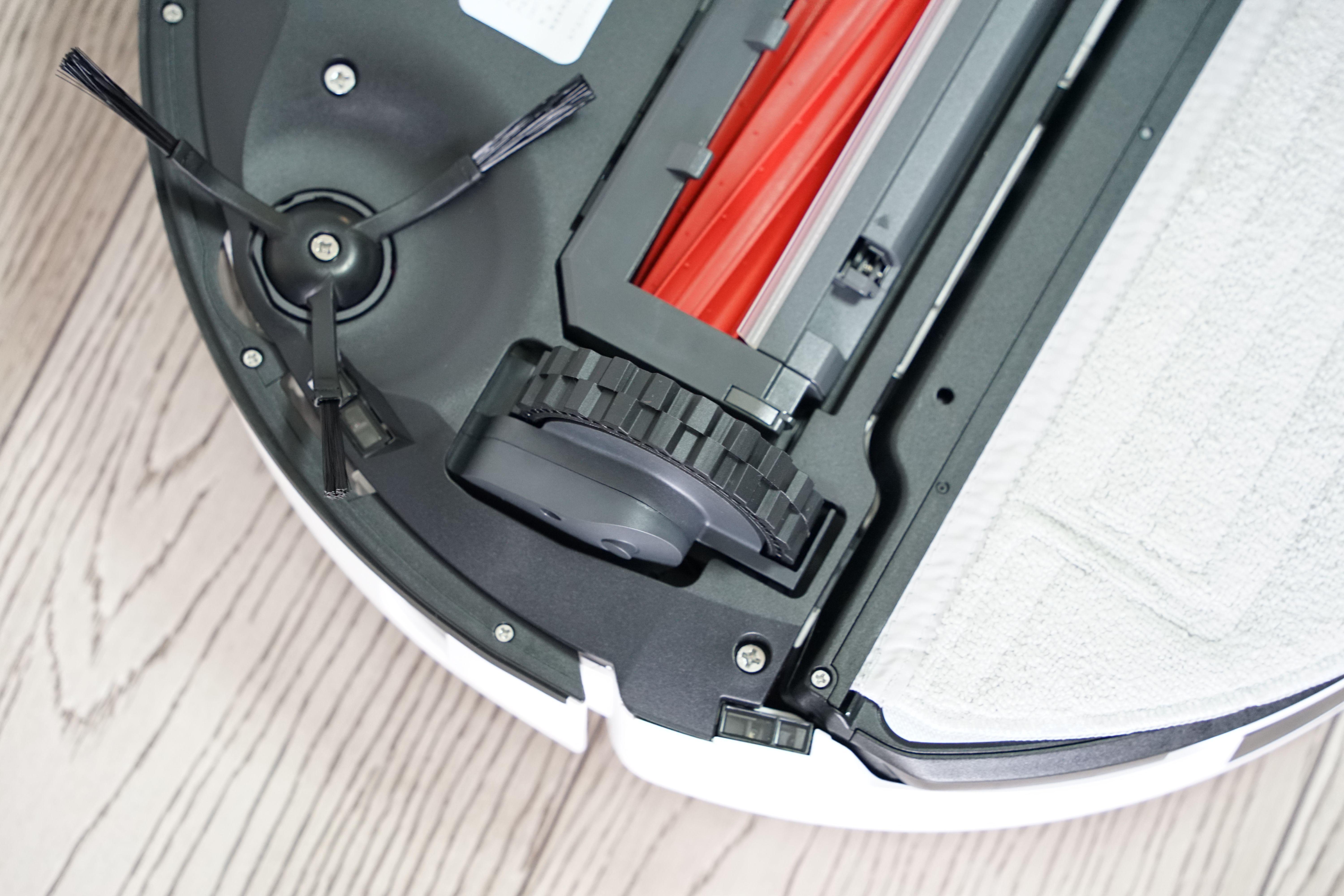 来到石头自清洁扫拖机器人G10背面,可以看到底部依旧非常“复杂”,主要由边刷、主刷、万向轮、悬崖传感器及地毯识别等传感器及升降震动擦地模组组成。
