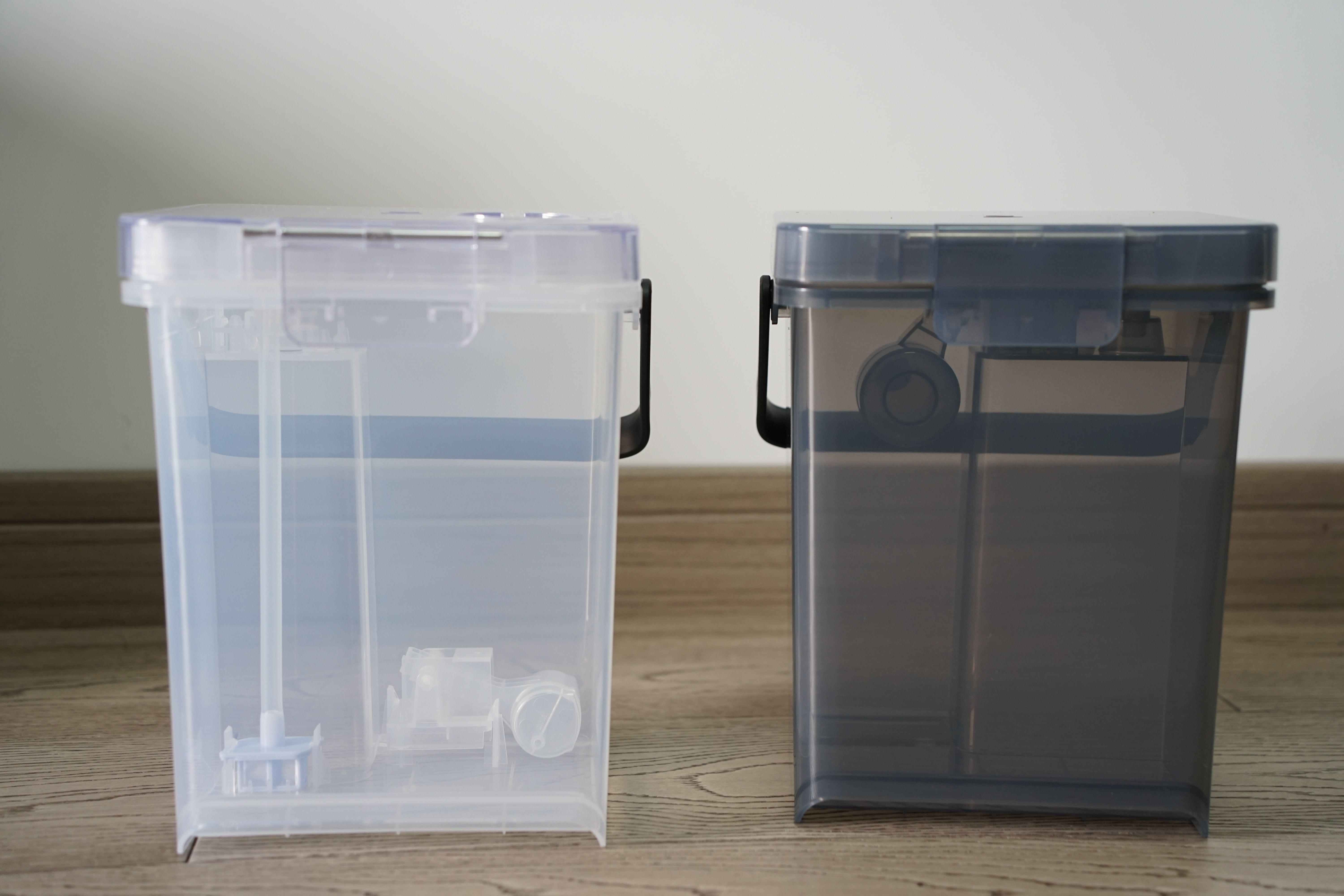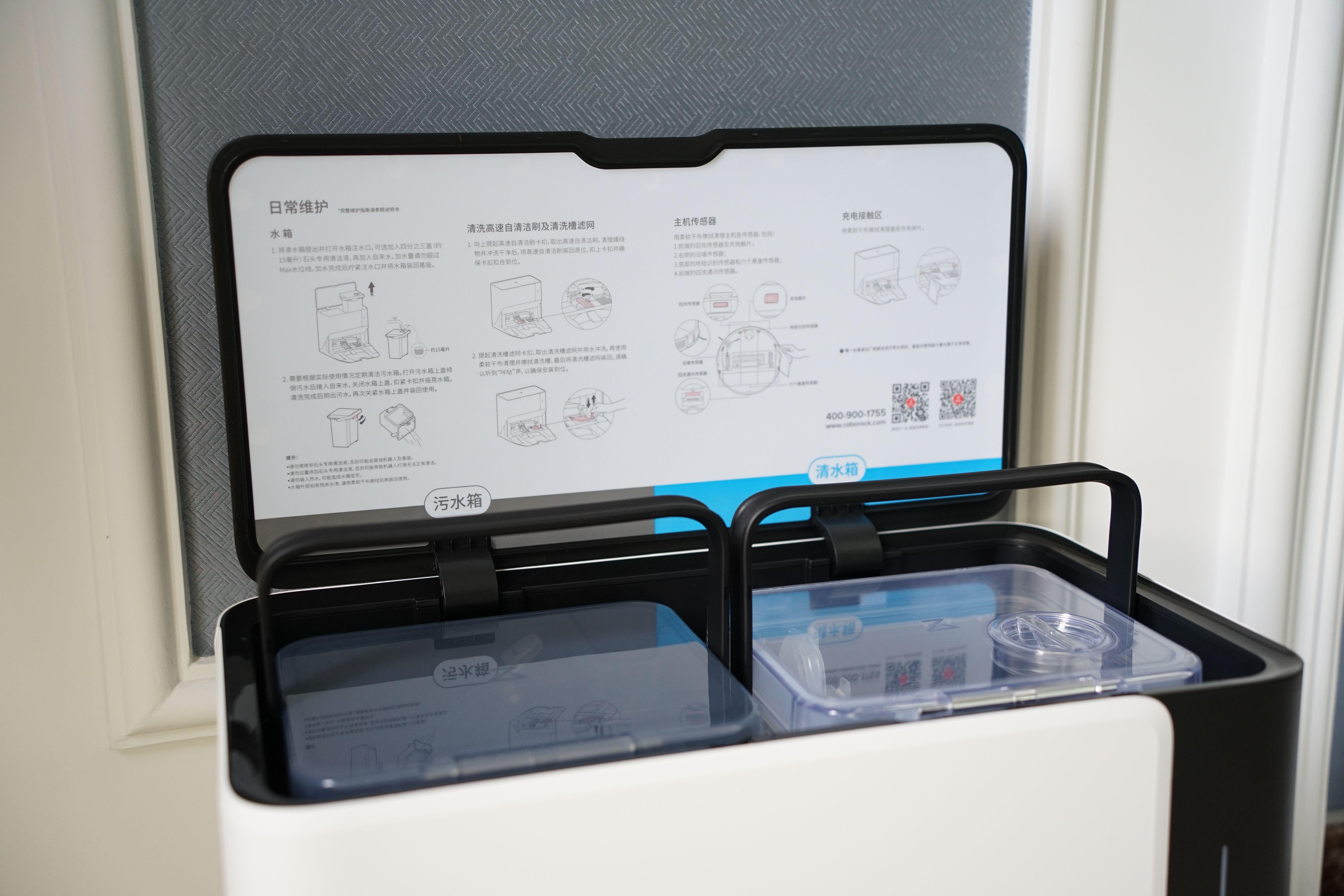 打开自清洁充电桩基座的上翻盖板,我们可以看到灰色的污水箱和透明的清水箱,分别用于收集清晰拖布产生的污水及为石头G10补水的清水。两个水箱均采用了提手设计,我们可以非常轻松地实现拿取。