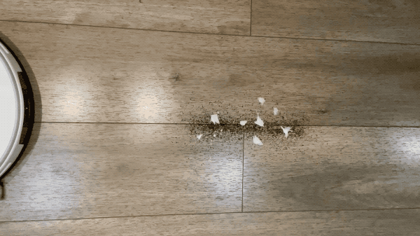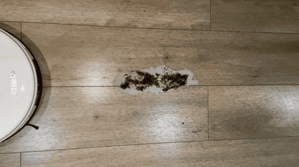 为了检测石头G10的扫拖效果,我们在地板上进行了实测,测试对象为不均匀洒在地板上的茶叶及纸屑。可以看到,石头G10启动清扫后,高达 2500Pa的吸力很快将茶叶与纸屑清扫,当我们将被清扫部分进行局部放大时,能很明显看到地板被拖的锃光瓦亮。