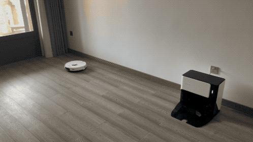通过动图可以看到,当石头自清洁扫拖机器人G10在拖地时遇到地毯时,扫拖机器人的拖布模组会自动升起,避免打湿地毯,同时还会开启地毯增压模式。