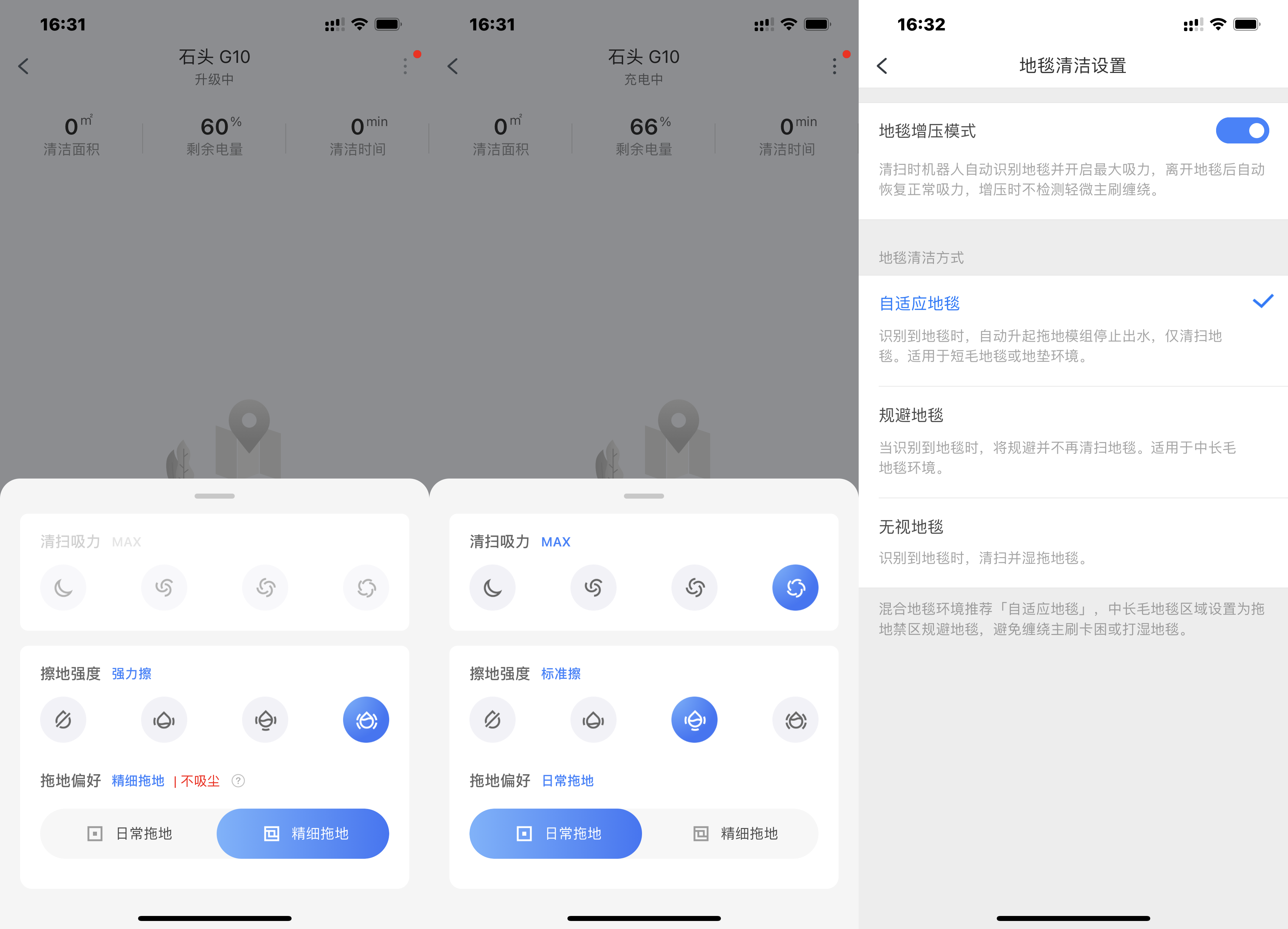 在开始拖地前,我们可以先在APP中进行个性化设置,可以选择不吸尘只拖地的精细拖地模式,共有四档擦地强度可选。当然,我们也可以选择边扫边拖的日常拖地模式,在调整擦地强度的同时也可调整清扫吸力。