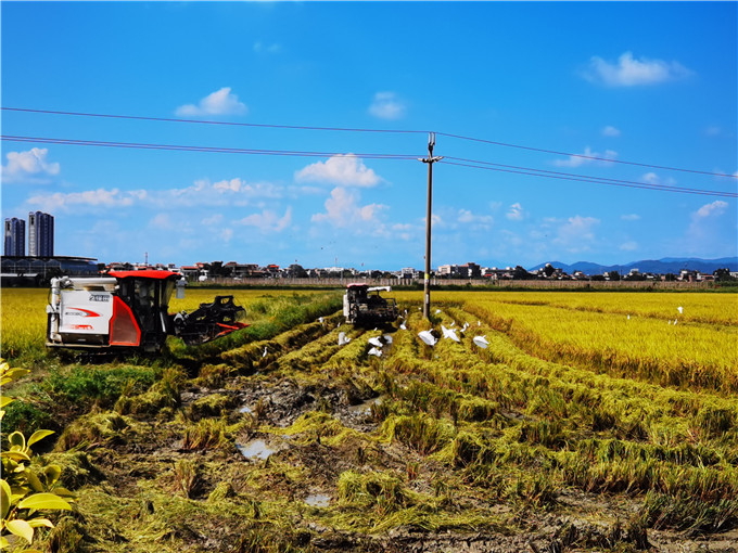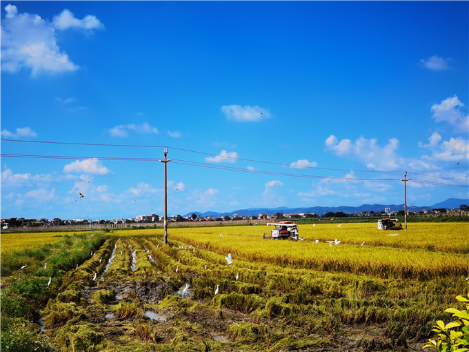 现在正是秋天水稻丰收的季节,全国各地都在举办丰收节,在广州市增城区石滩镇,藏着一个连片万亩水稻田,丰收的季节,大地金黄一片,收割机忙着收割水稻,成群的白鹭绕着收割机,在田野里跳起了芭蕾舞,形成了广州大都市罕见的田园风光。