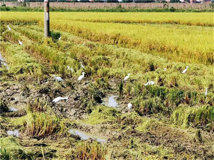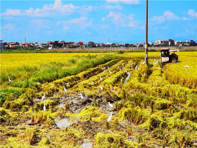 这样的美景除了吸引都市人去观赏拍摄,还吸引了鸟类的精灵前来,就是被称为仙鹤的白鹭,成群结队的白鹭在空中盘施盘旋,一发现有收割机,则在空中漂亮的划一个圈,然后落在收割机的旁边,寻觅着水稻收割后稻田里的小鱼小虾、田螺贝类。吃饱了停留在旁边休憩嬉戏。