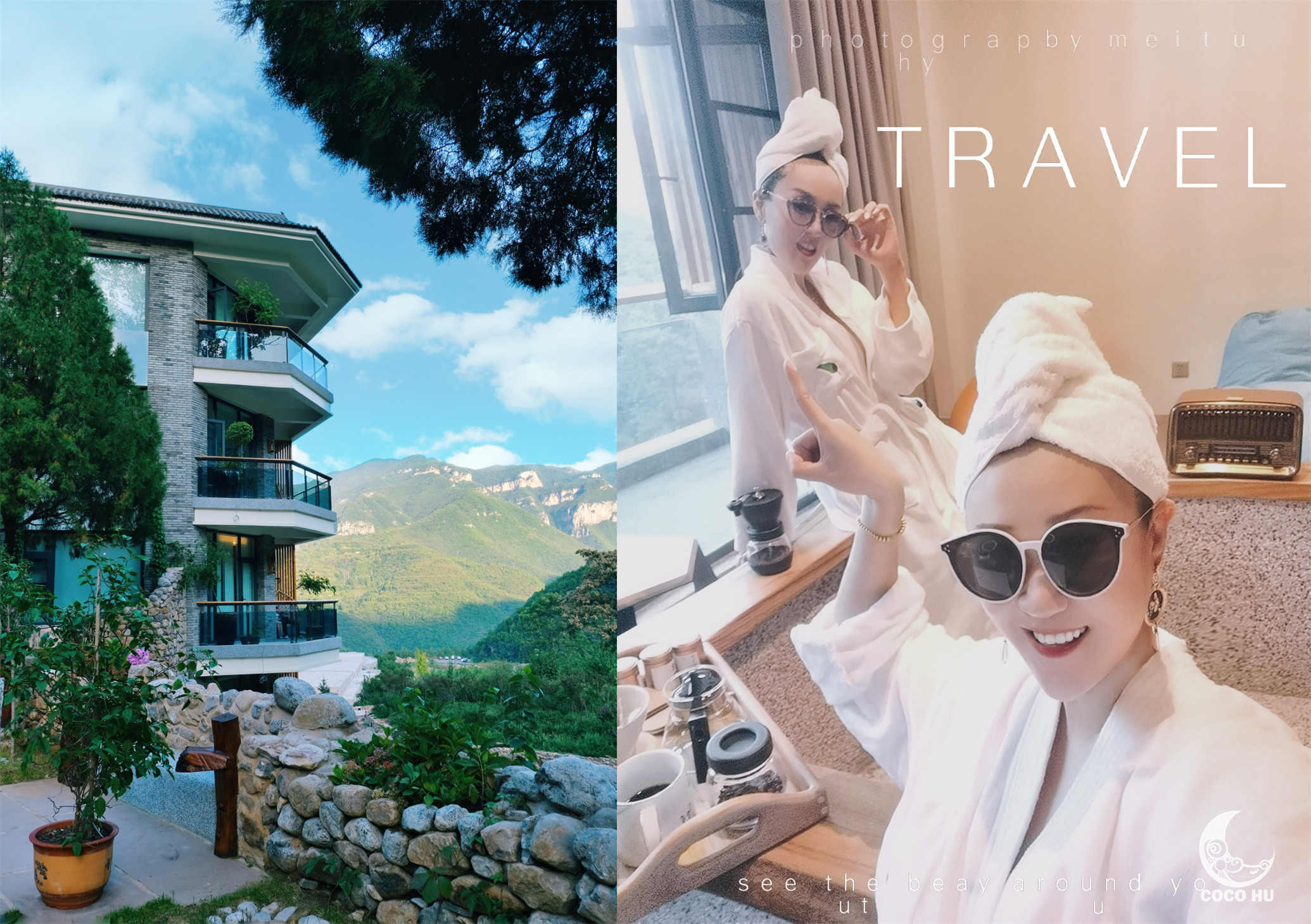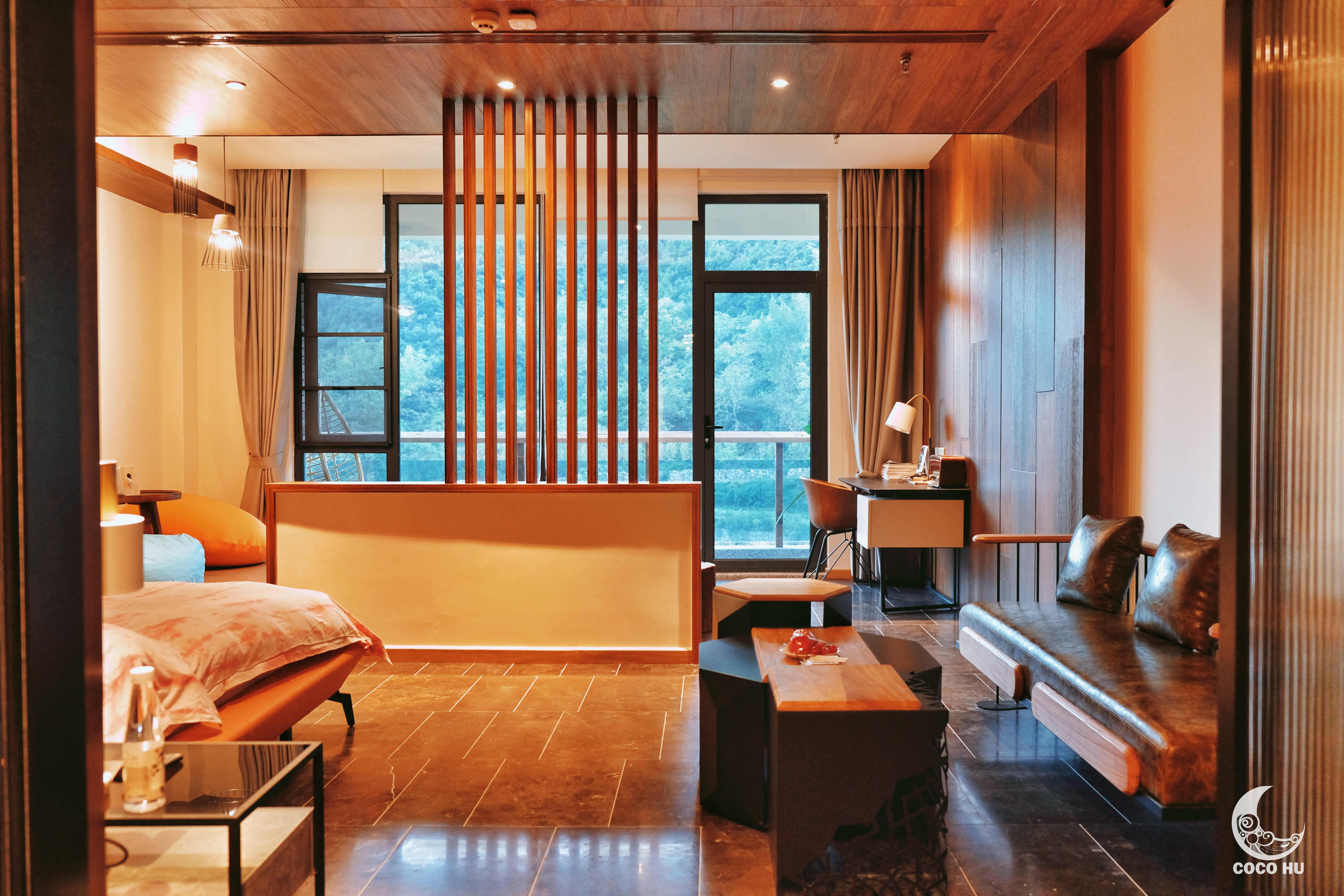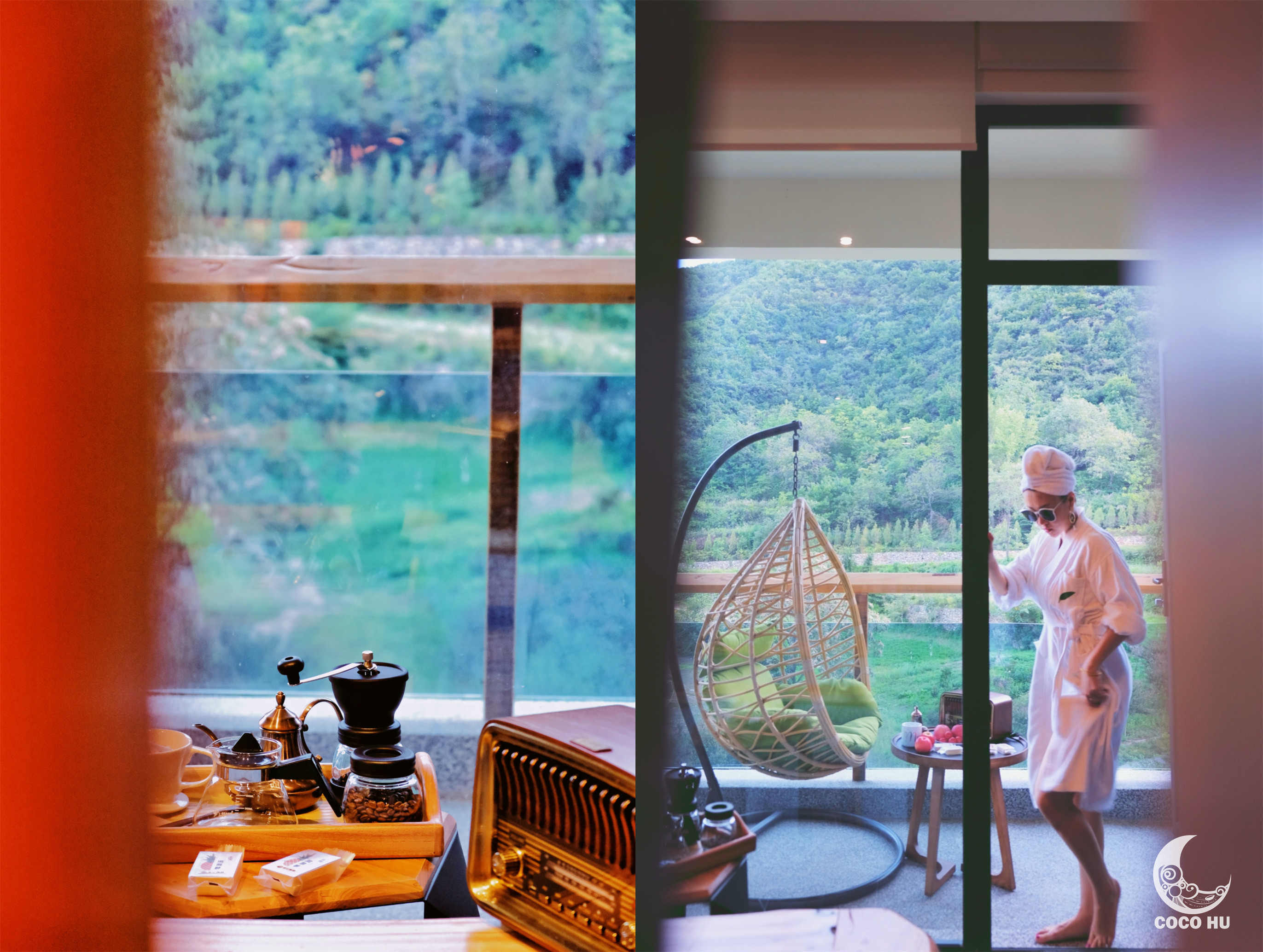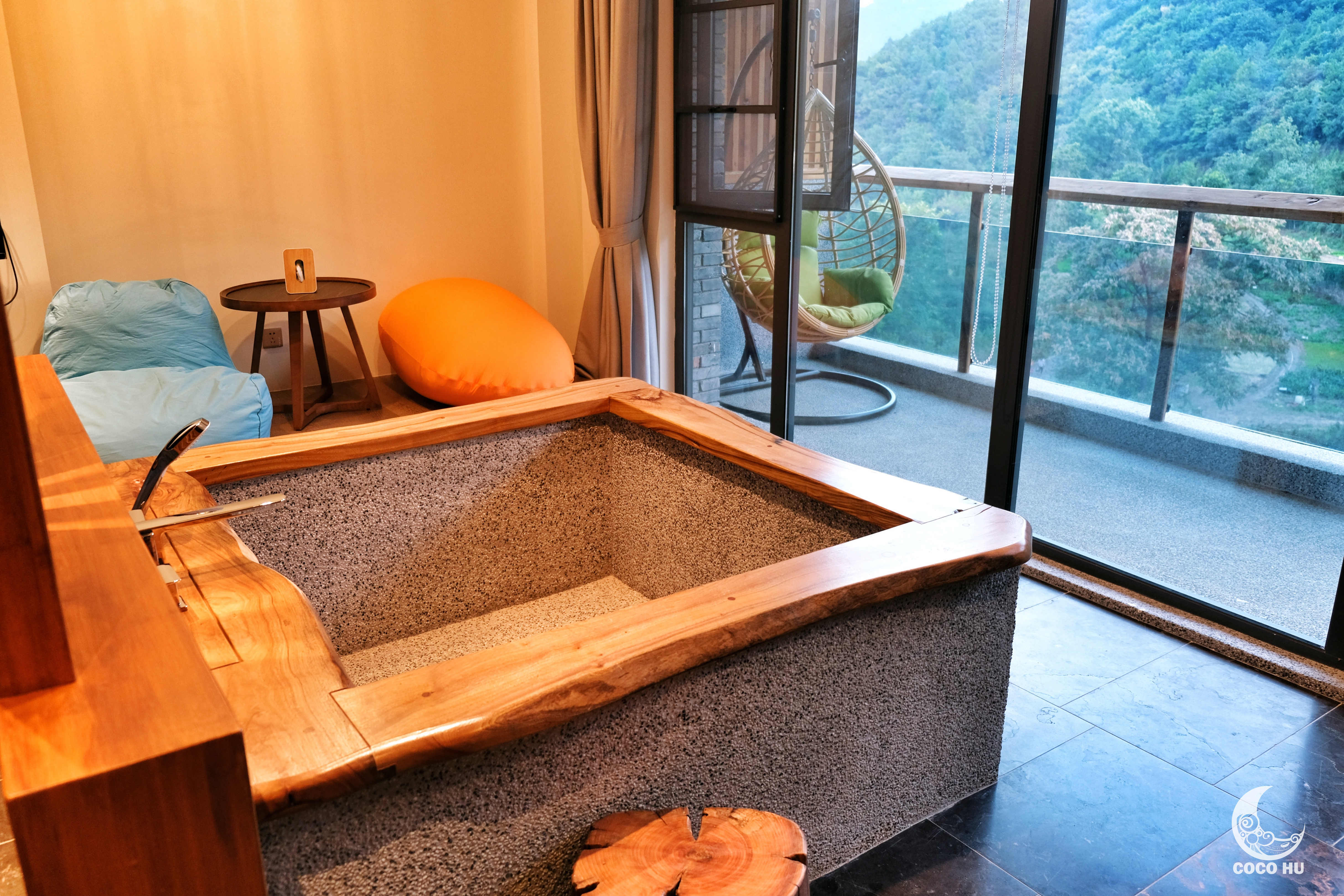 房间内超大的方形泡汤池,面对着落地窗与远山美景,由内而外一扫旅途疲累;手磨咖啡和管家手写慰问卡,让人倍感温暖~在深山古村落中,能喝到手磨咖啡,真的幸福到要飞起!