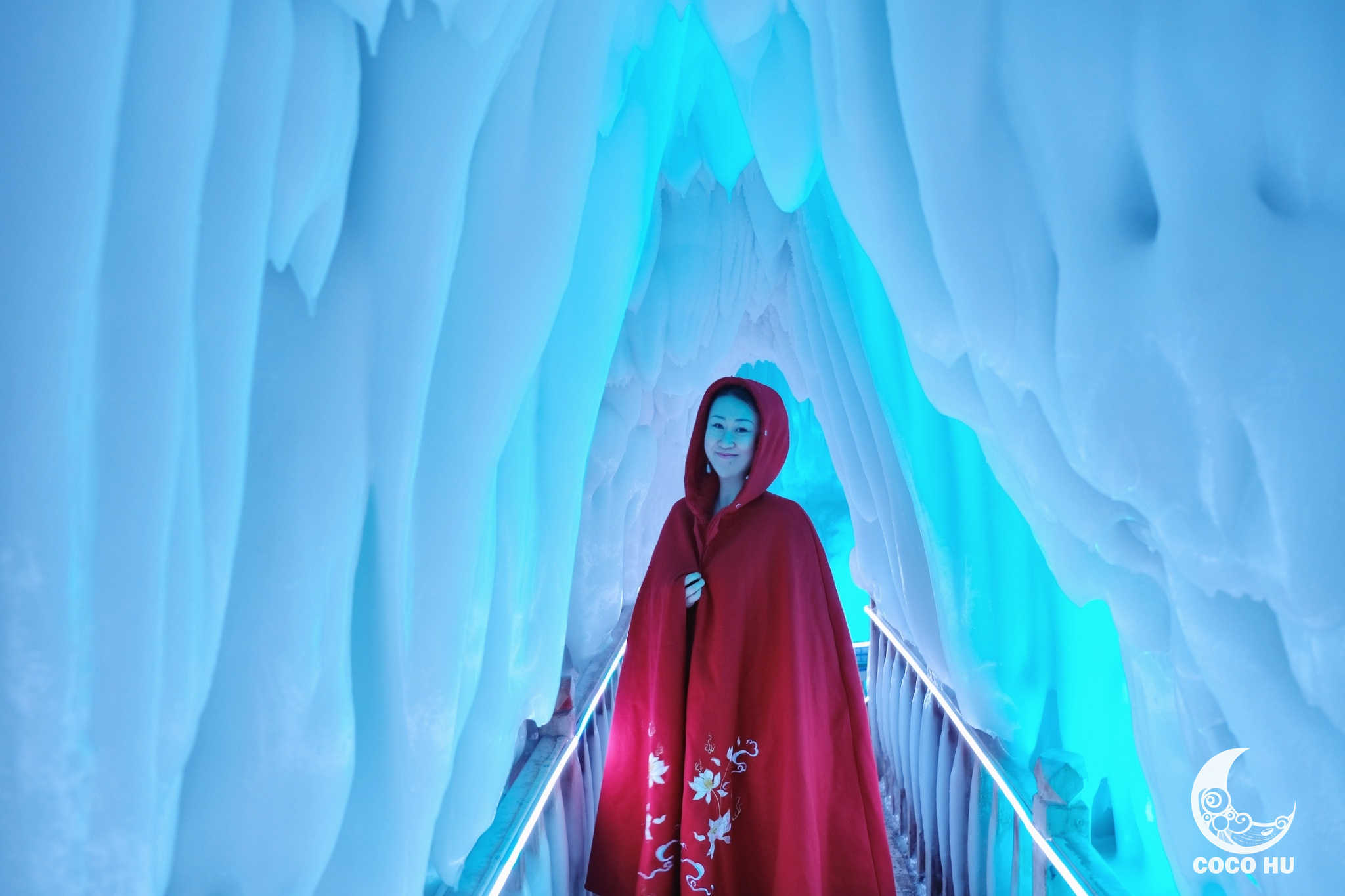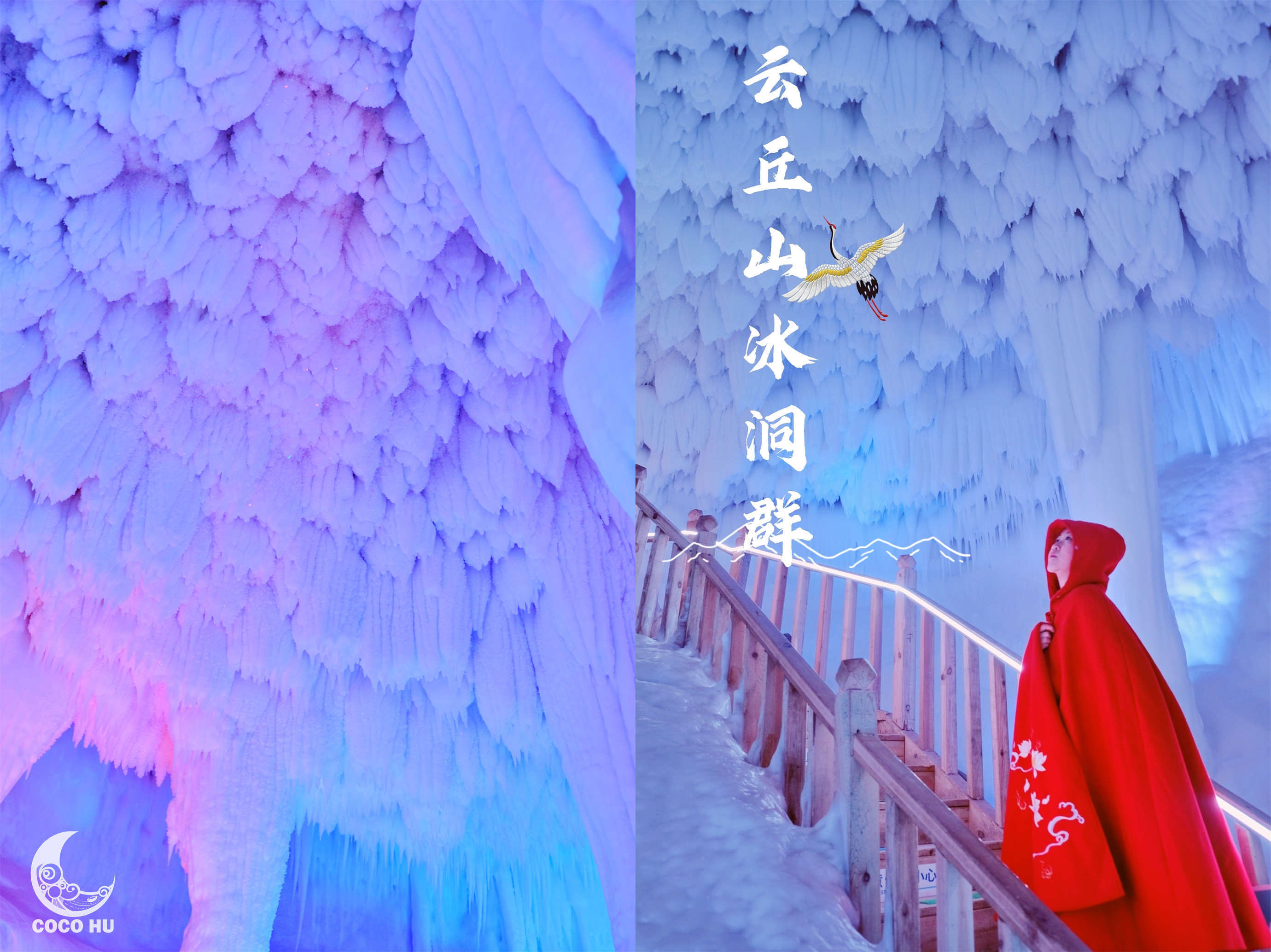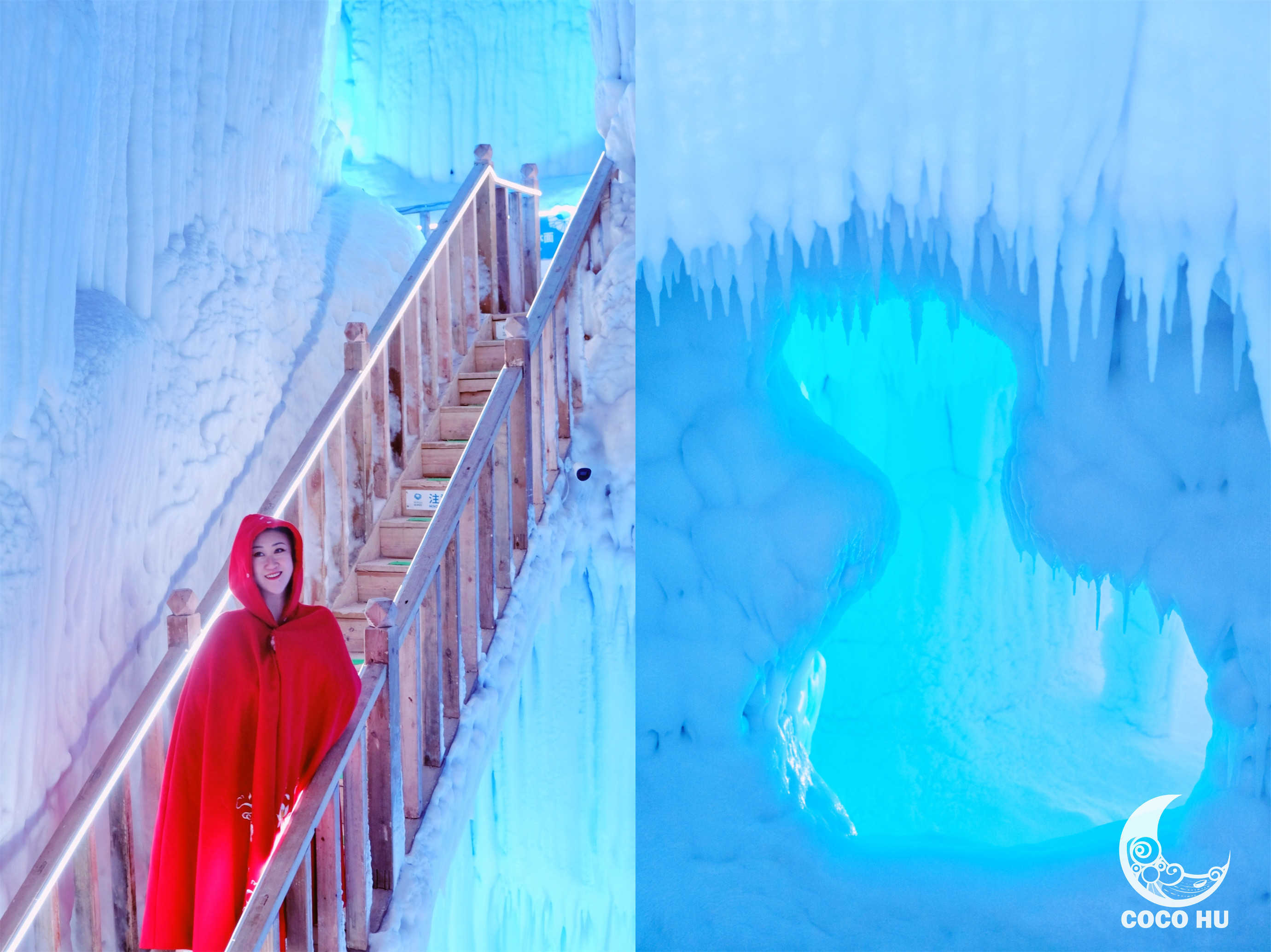 整个冰洞群由11个洞腔组成,总长度100多米,最宽处12米,最高15米,洞内4壁结冰,冰柱、冰笋、冰钟乳、冰石花分布整个空间,大大小小的冰凌晶莹剔透、峰峦叠嶂,在五彩灯光的映衬下,俨然仙境~