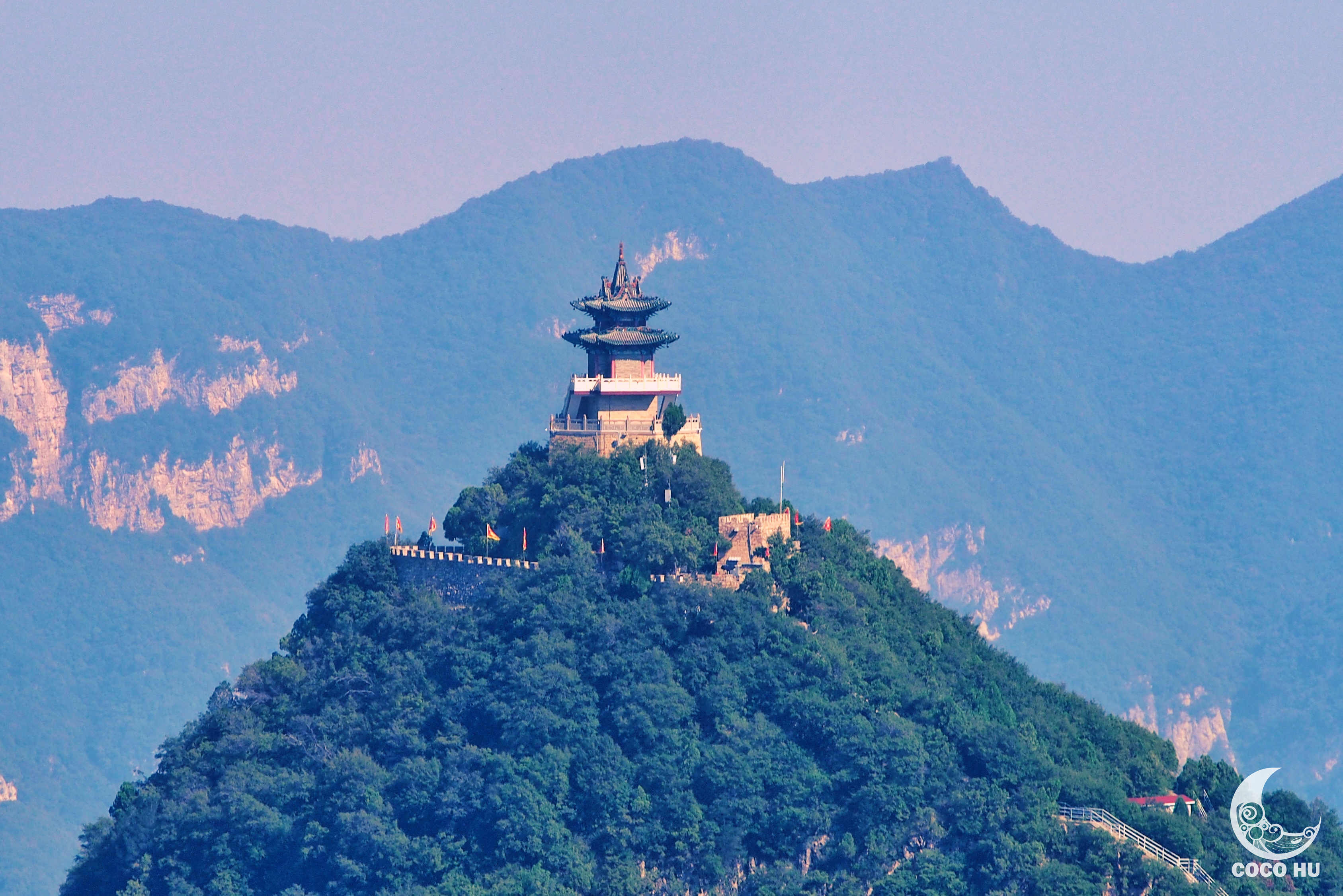 登上山顶便是玉皇阁,玉皇阁长6.4米,宽6.32米,高15米,是一座建在无梁殿上的重檐十字歇山顶的阁楼,四周有汉白玉围栏。内供奉玉皇大帝、日、月神。