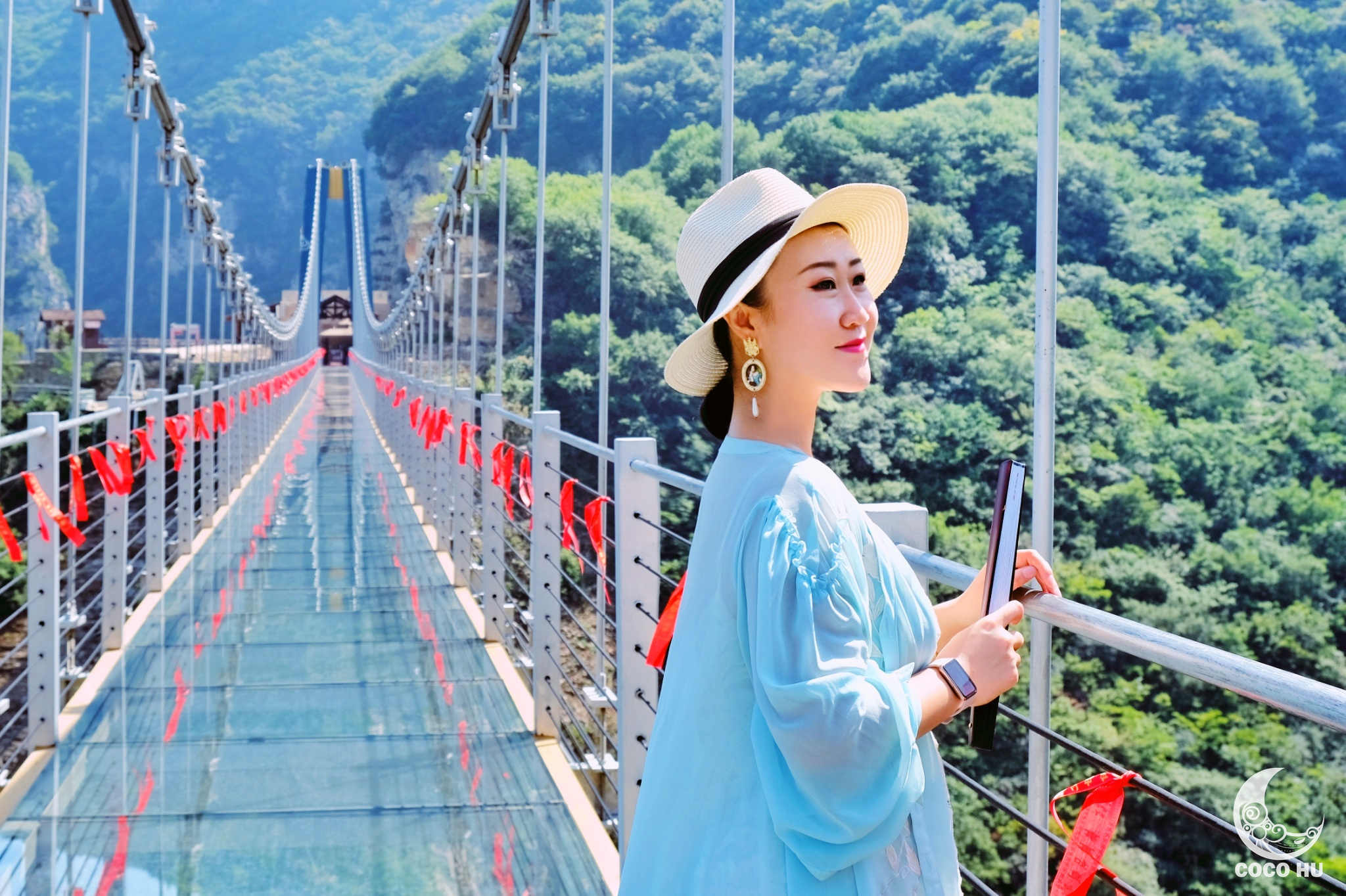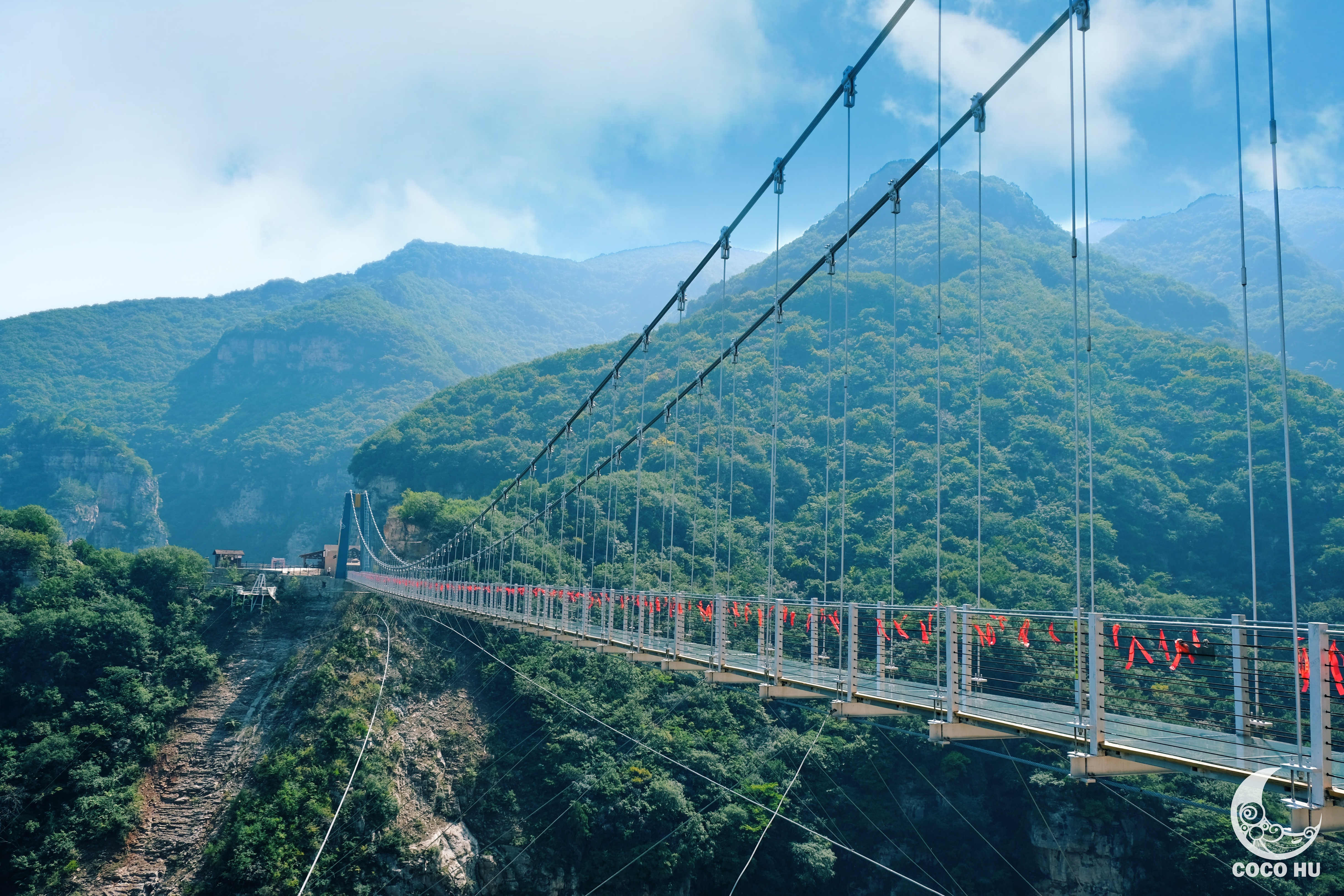 下山途径的第一个大的游玩项目,便是云丘山景区内最浪漫的地方——鸳鸯桥。鸳鸯桥横亘在神塔和圣母洞之间,远远望去似飞龙从峡谷中飞起。
