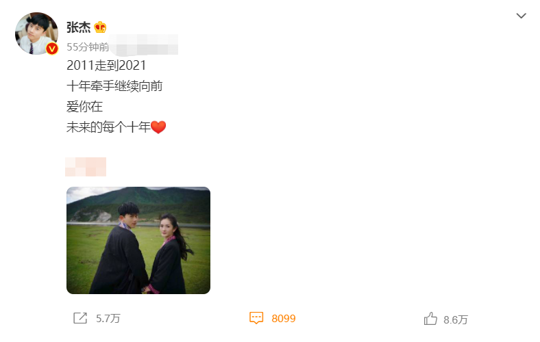 近日,著名歌手张杰在个人社交平台晒出与妻子谢娜的合照庆祝二人结婚十周年,并配文称“2011走到2021,十年牵手继续向前,爱你在,未来的每个十年”,引起网友的关注与热议。