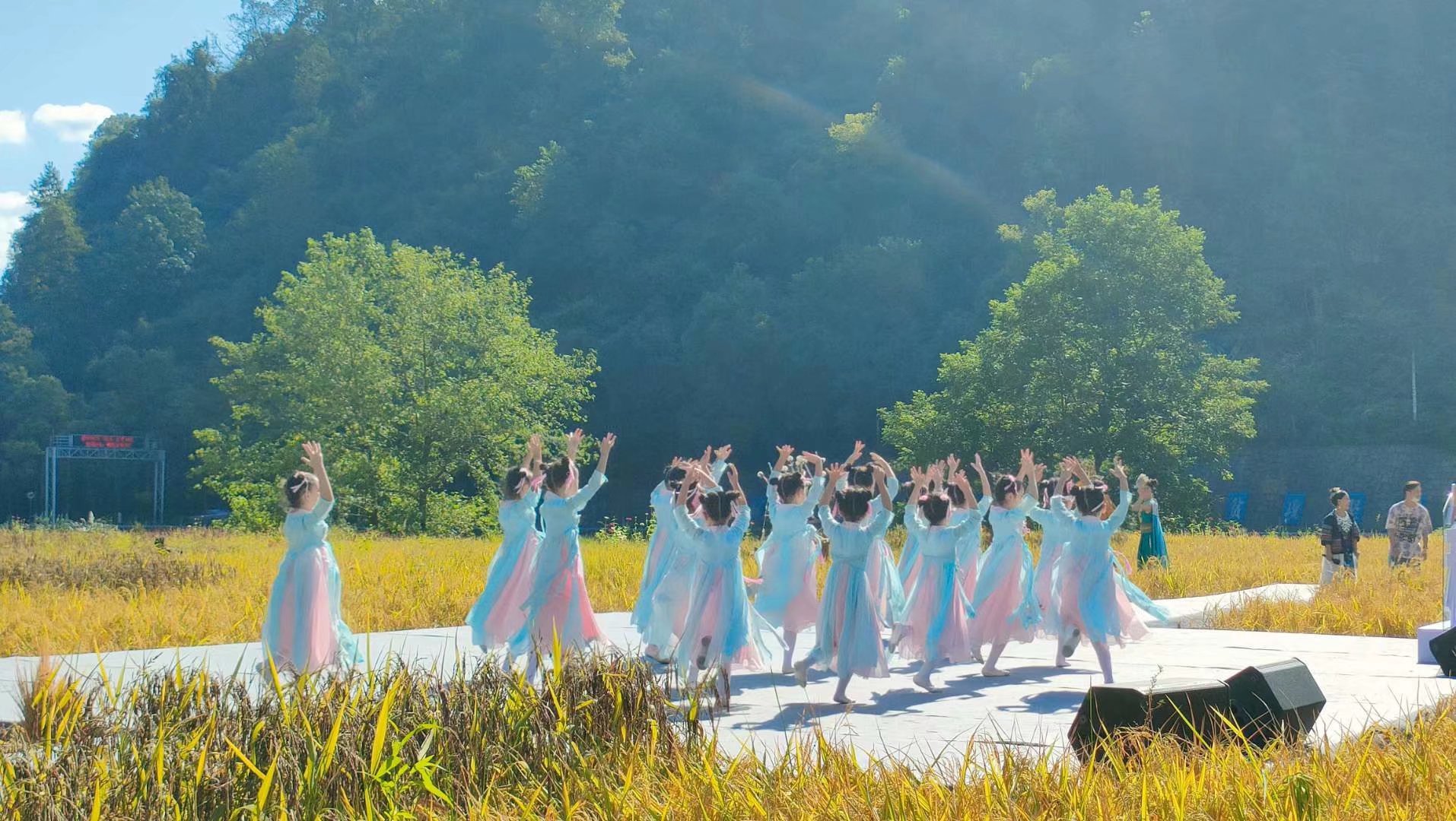 9月25日,2021黄龙洞秋收节在小朋友们热闹欢快的歌舞表演中开场(摄影:毛诚龙)