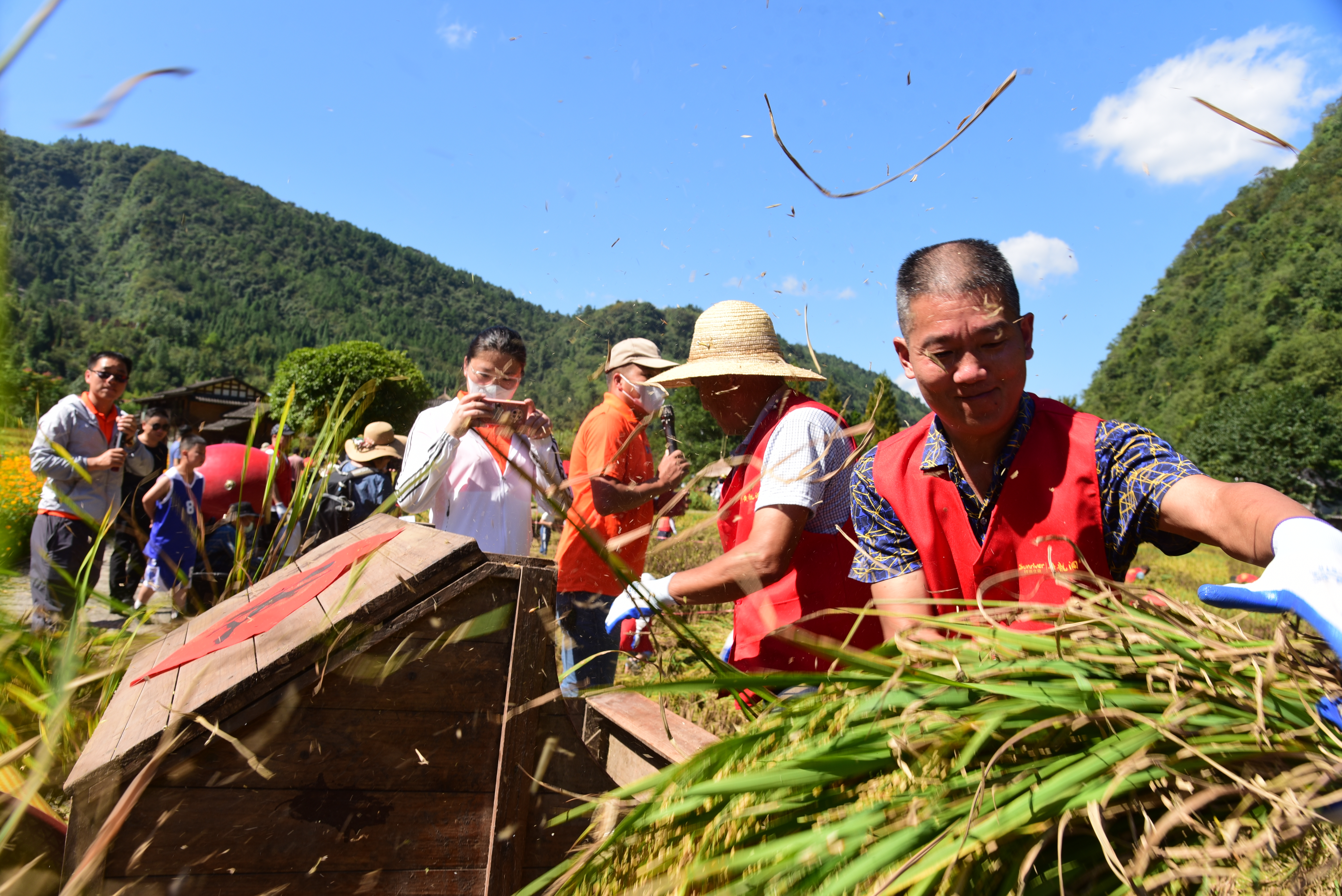 稻谷收割比赛的火热场面