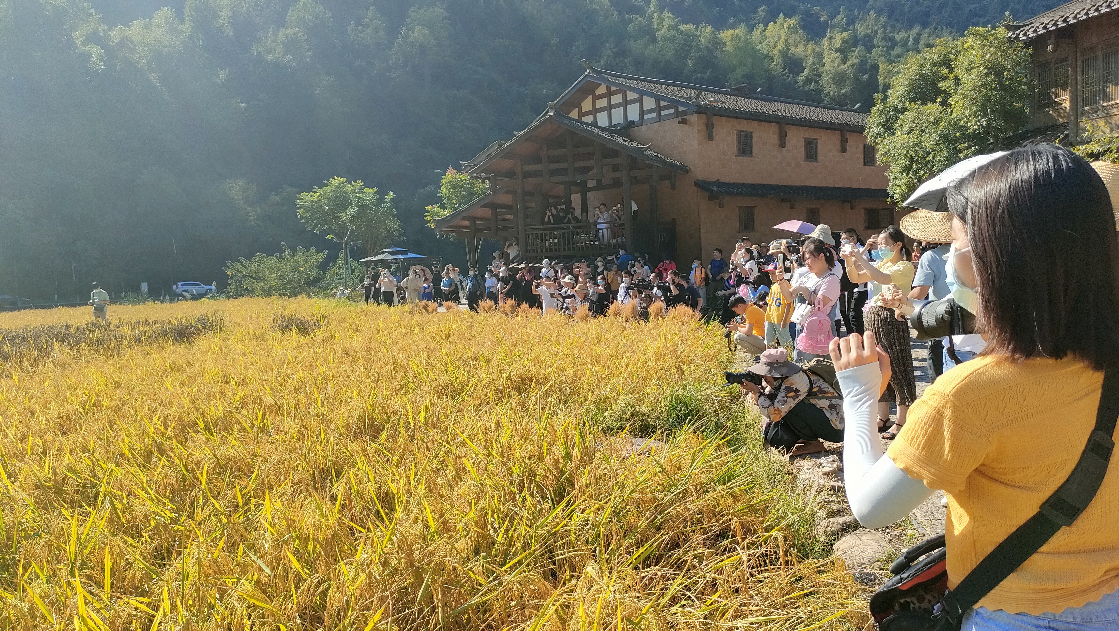 游客围观稻田秋收