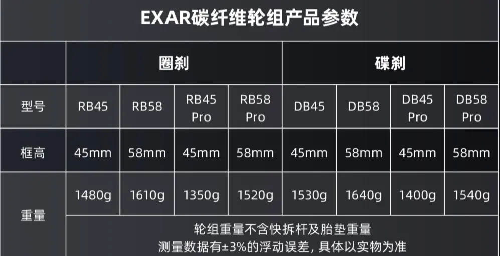 先来看看官方的纸面数据:价格方面,圈刹和碟刹的普通版本价格控在了四千元以内,到手3999元。圈刹和碟刹的Pro版本则控制在了5200元,到手5199元。框高选择方面,EXAR较为局限,目前只提供45mm和58mm框高版本。外胎兼容方面,开口和真空均可兼容,暂无管胎版本。