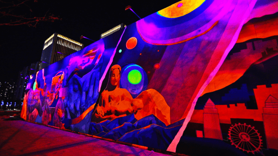 将中山铁桥、羊皮筏子、黄河、嘉峪关、敦煌飞天、环球港地标双子塔等兰州城市历史人文地标、丝绸之路元素以涂鸦方式展现,置身其间,一副宏大的西部风情画卷徐徐展开。以多样性角度去聆听城市的自白,记录城市的变迁。