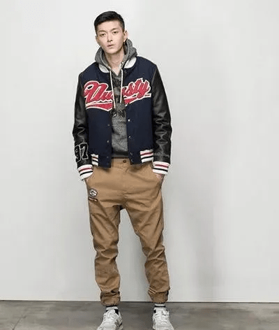棒球领夹克外套搭配连帽卫衣卡其色束脚休闲裤与运动鞋。