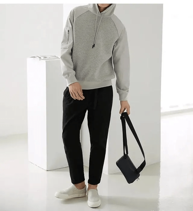 简约休闲干练的连帽卫衣搭配黑色休闲裤与休闲鞋。
