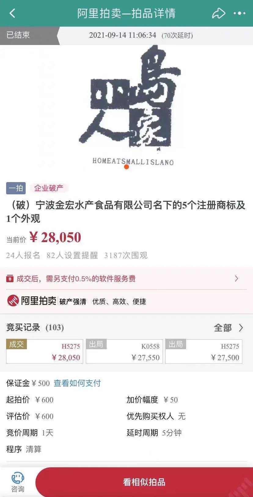 经债权人会议同意,涉及该品牌的五个商标和一个外观设计于9月13日上午10点,在淘宝网司法拍卖平台上进行公开拍卖,起拍价为600元,经过25个小时70次延时103轮竞价,最终以28050元价格拍卖成交,相比起拍价溢价达46倍。
