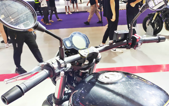 这块仪表和昨天聊过的闪500是同款的设计,圆形的偏置仪表搭配复古车型也非常协调。手把的角度比较平直,但它的定位是Scrambler运动复古,所以坐姿应该还是比较直立舒适的。