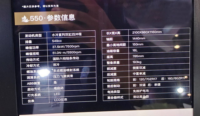 动力部分,逸550搭载一台实际排量549cc的,直列双缸水冷发动机,最大功率37.5kw/7500rpm,最大扭矩51Nm/5500rpm,同时标配滑动离合器。