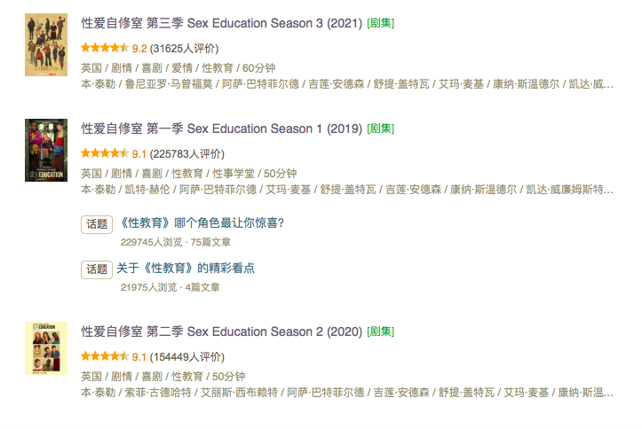 《性爱自修室》是Netflix推出的英国青春系列剧,去年还获得了英国国家电视奖“最佳喜剧”的提名,三季均在9.0分以上。