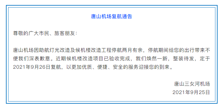 乐居买房讯 唐山机场因助航灯光改造及候机楼改造工程停航两月有余,近期候机楼改造项目已验收完成,定于2021年9月26日复航。