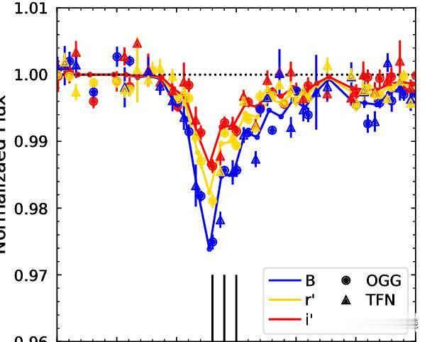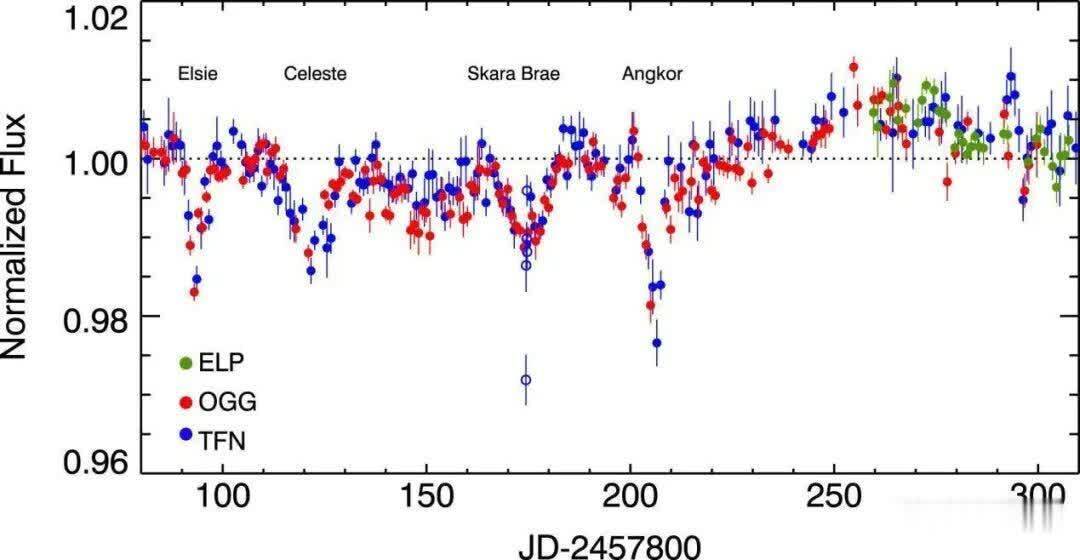 在r’波段的虎斑星的LCOGT时序测光中显示了”埃尔西”系列,每个点是图例中所示LCOGT 0.4 m测站的每日平值。图源:iopscience