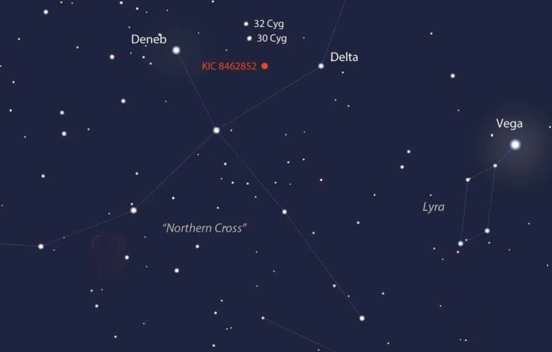 KIC 8462852,摄于2015年10月15日。这是一颗F3 V星(黄白色矮星),距地球约1,480光年。图片来源:Gianluca Masi