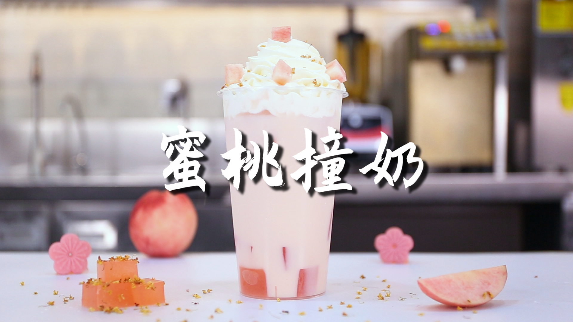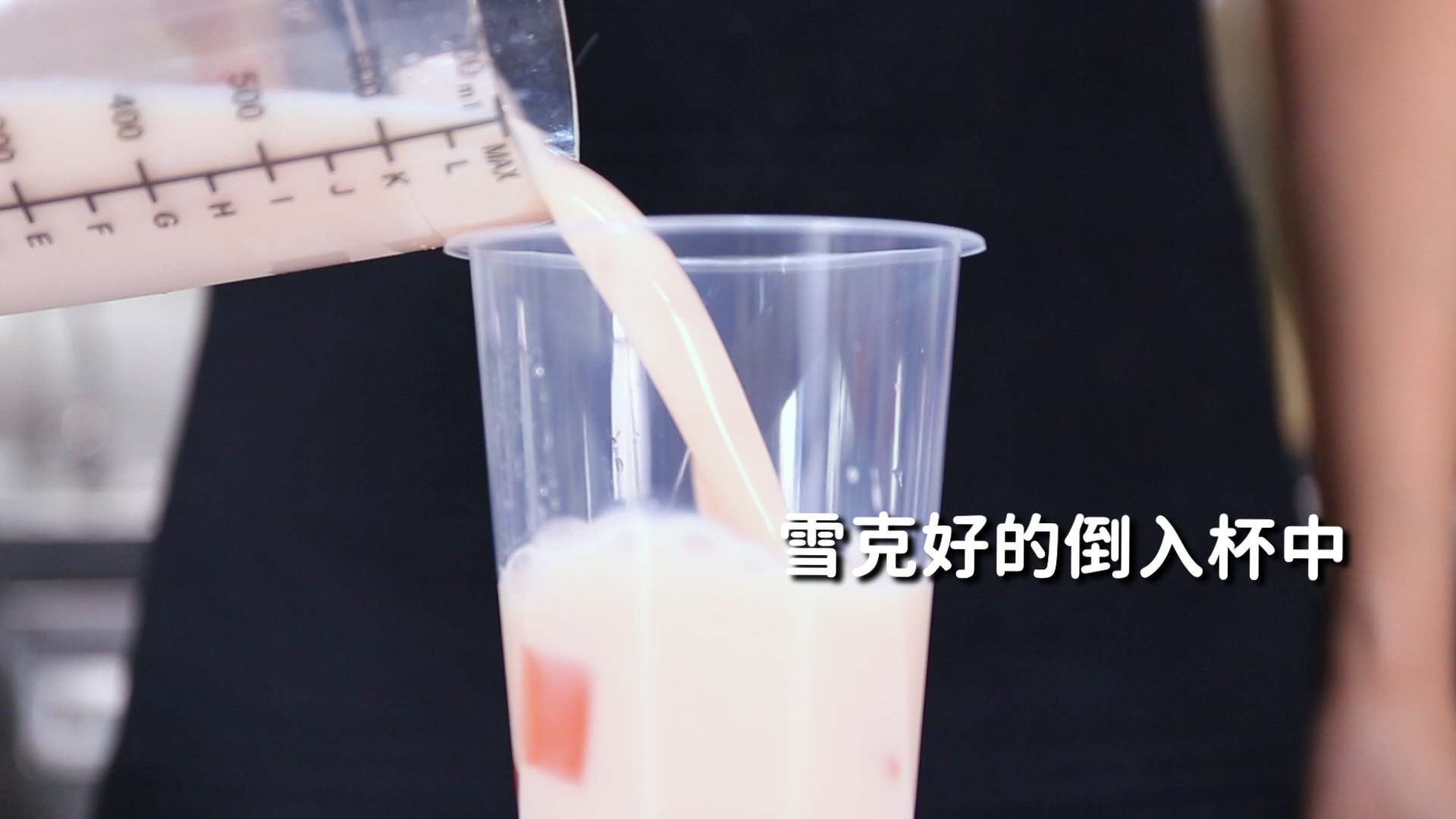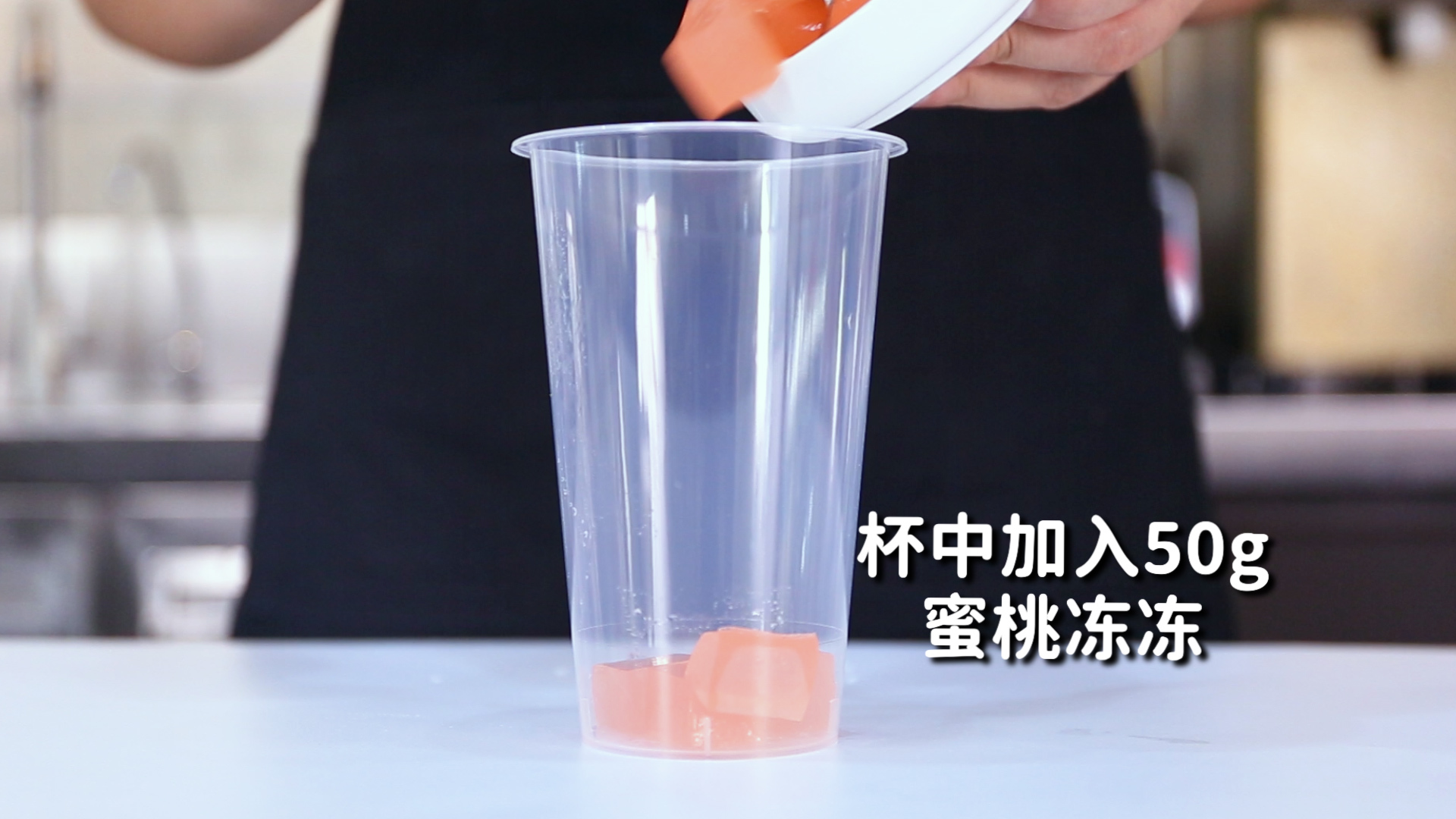 第4步:在出品杯中加入50g蜜桃冻冻,将雪克好的奶茶倒入出品杯中至九分满