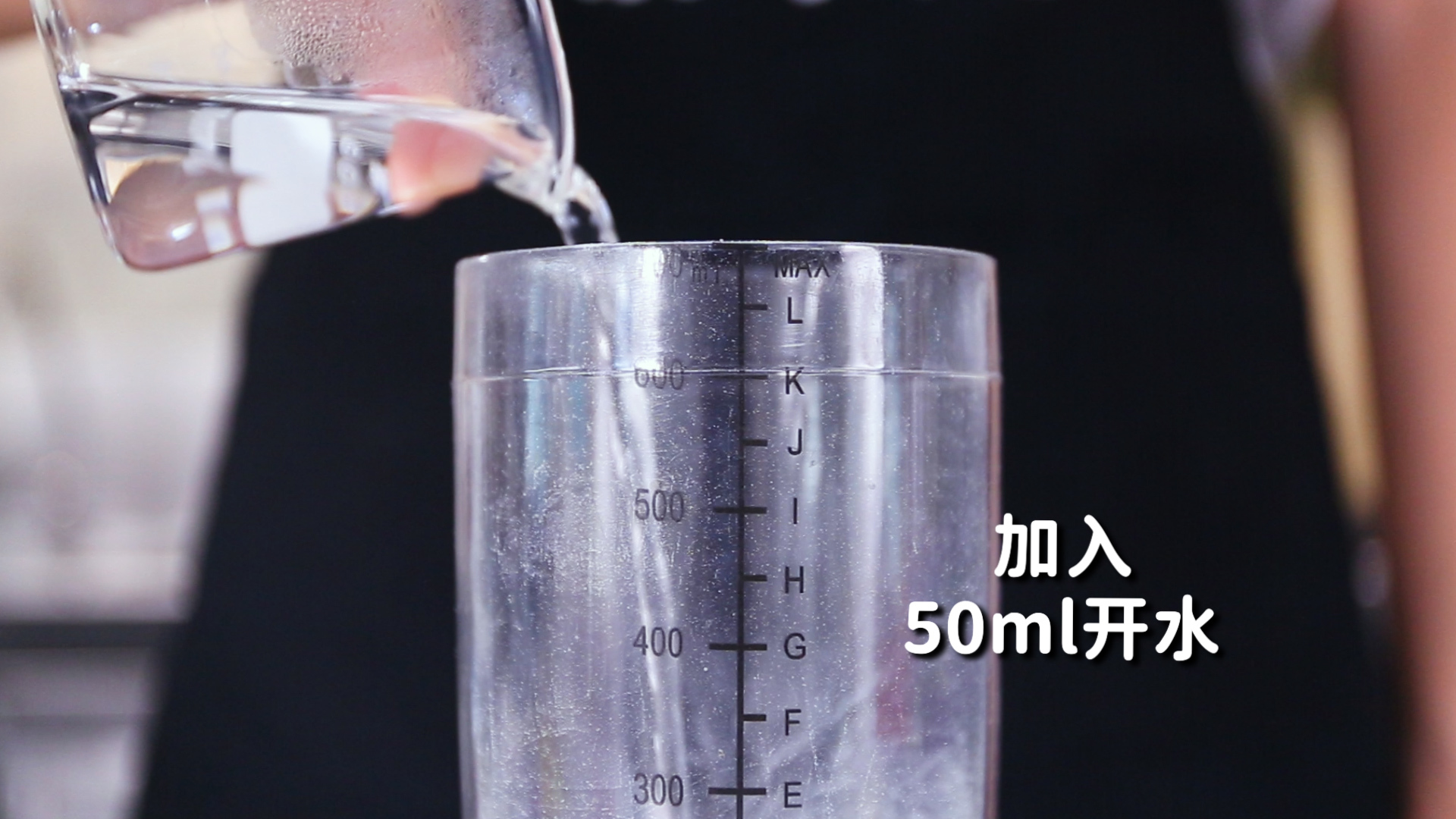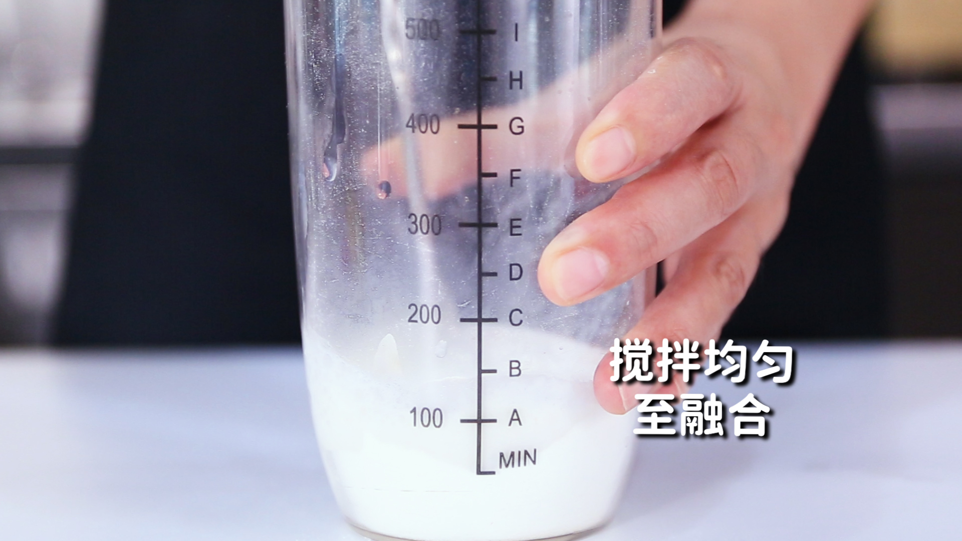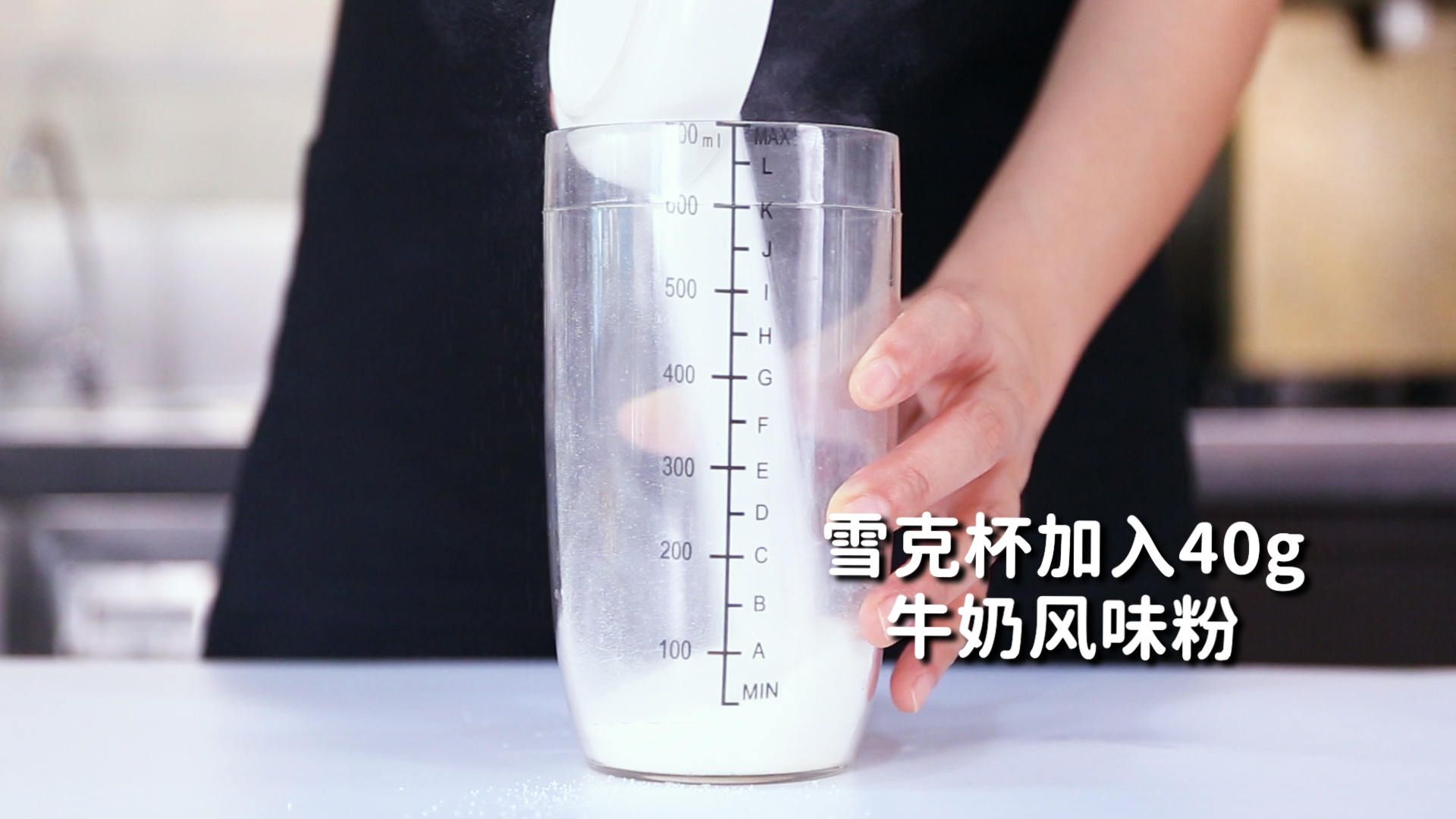 第1步:先在雪克杯中加入40g特调牛奶风味粉、50ml开水,用吧更勺搅拌均匀至充分融合,再加入适量冰块,继续搅拌均匀后备用