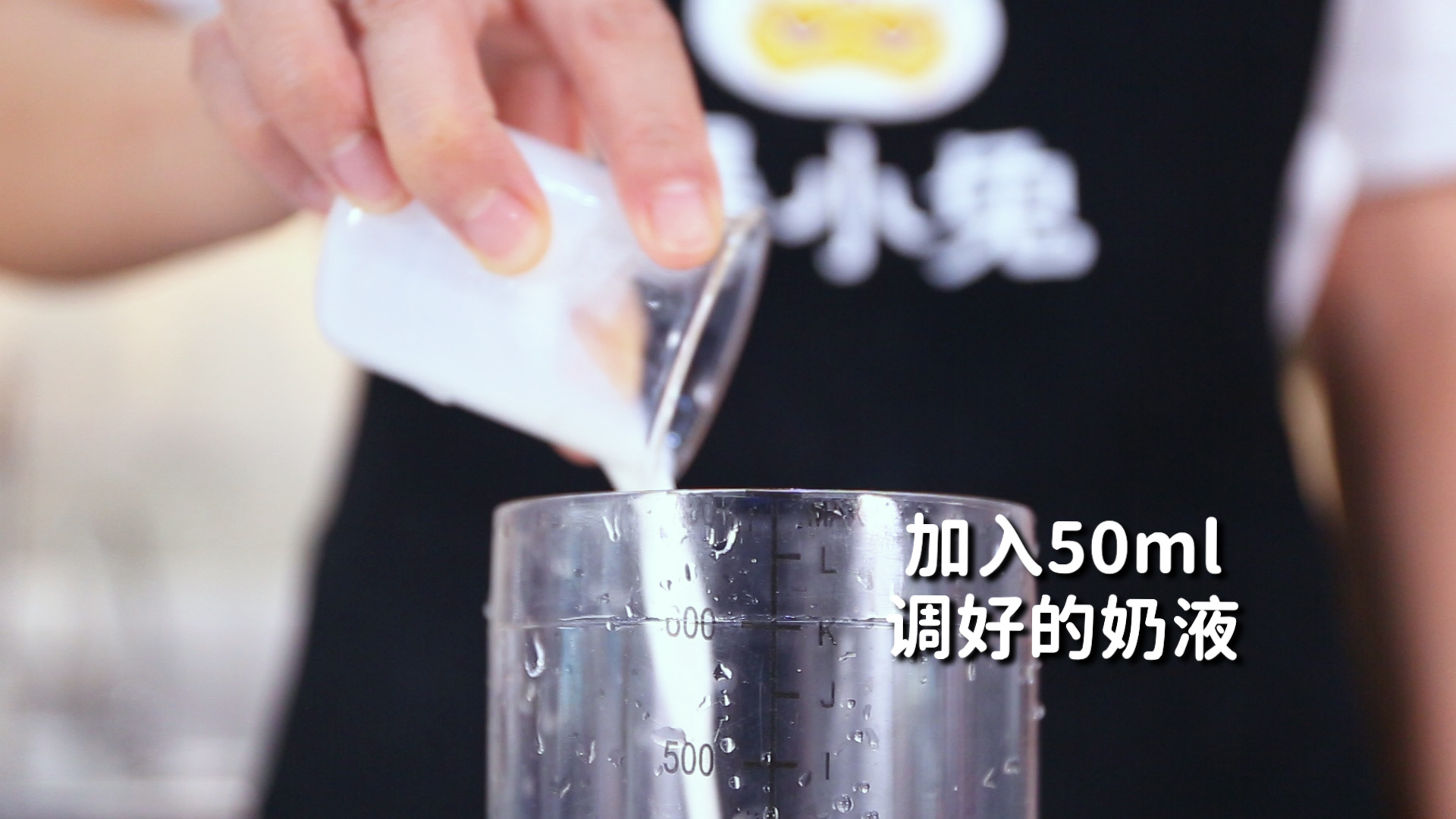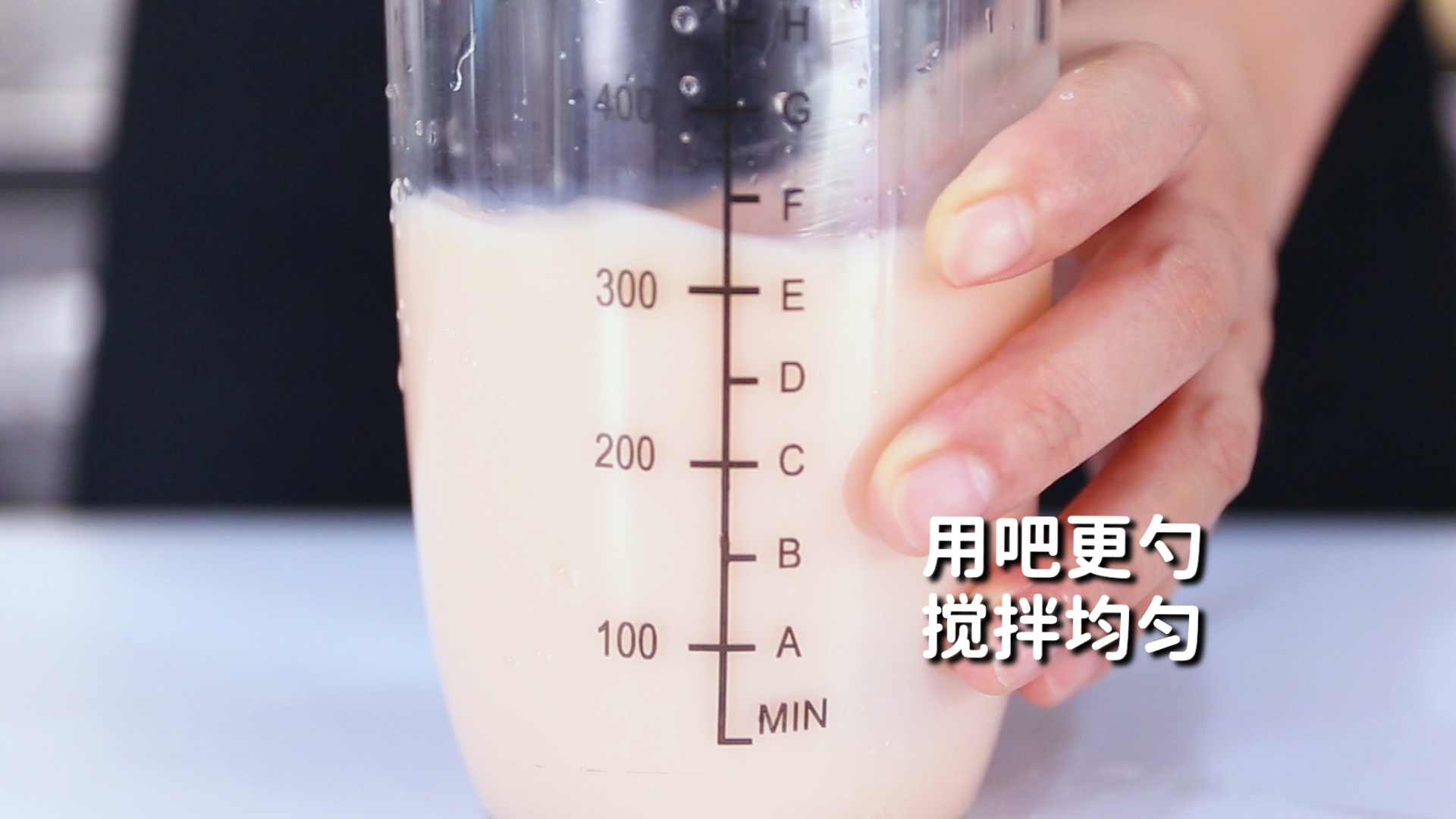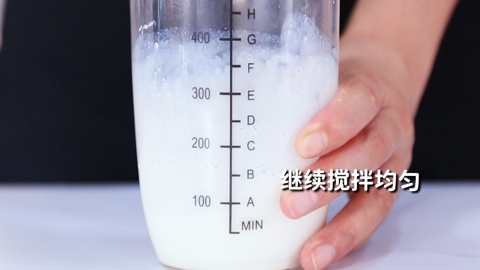 第1步:先在雪克杯中加入40g特调牛奶风味粉、50ml开水,用吧更勺搅拌均匀至充分融合,再加入适量冰块,继续搅拌均匀后备用
