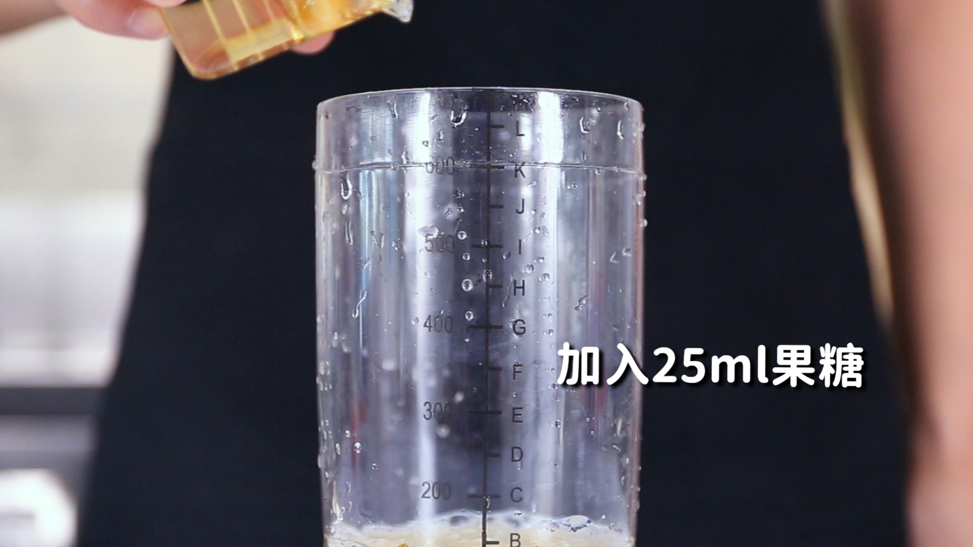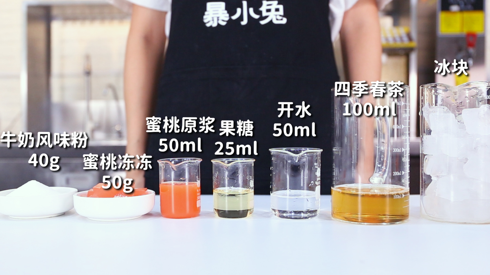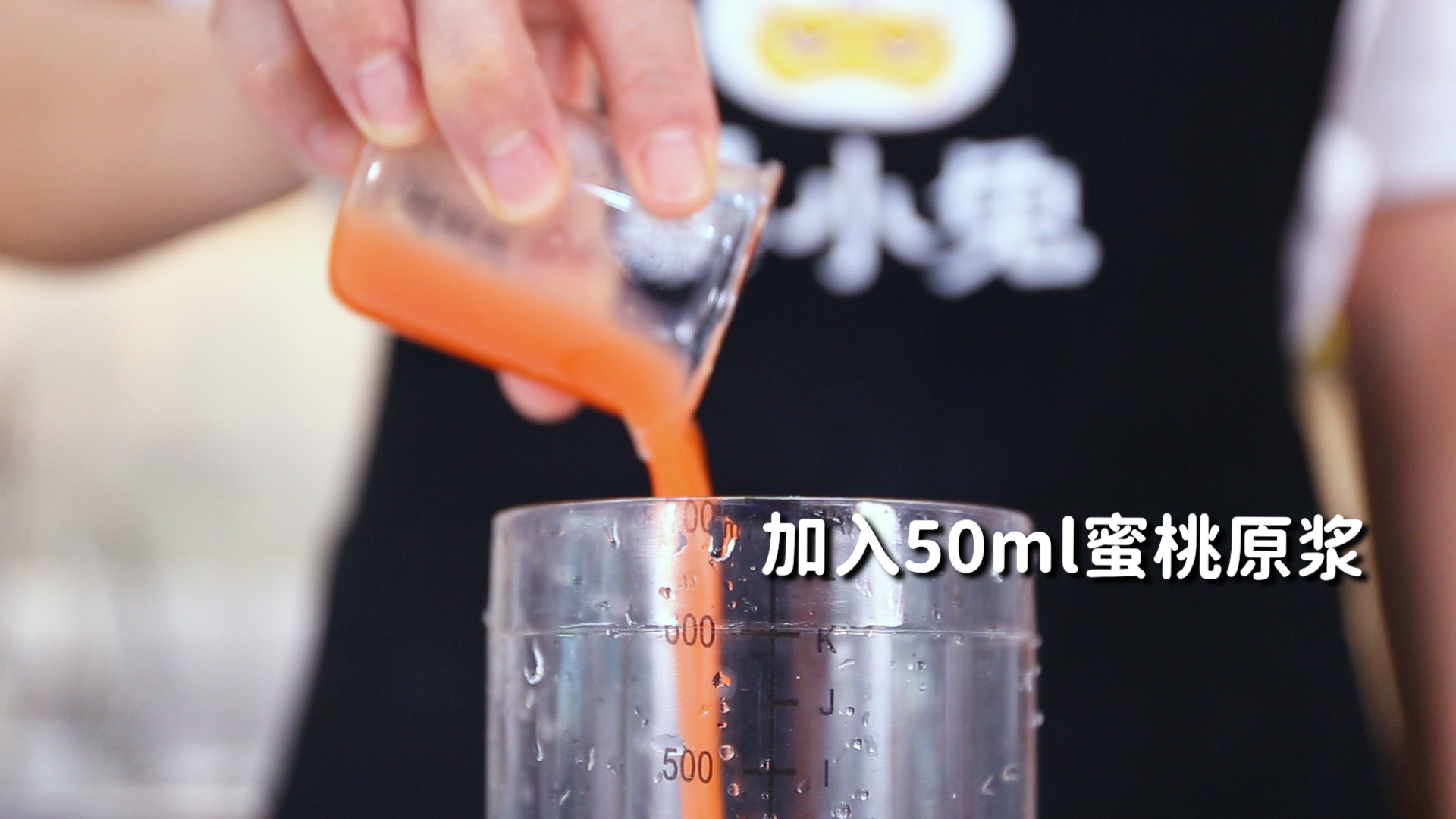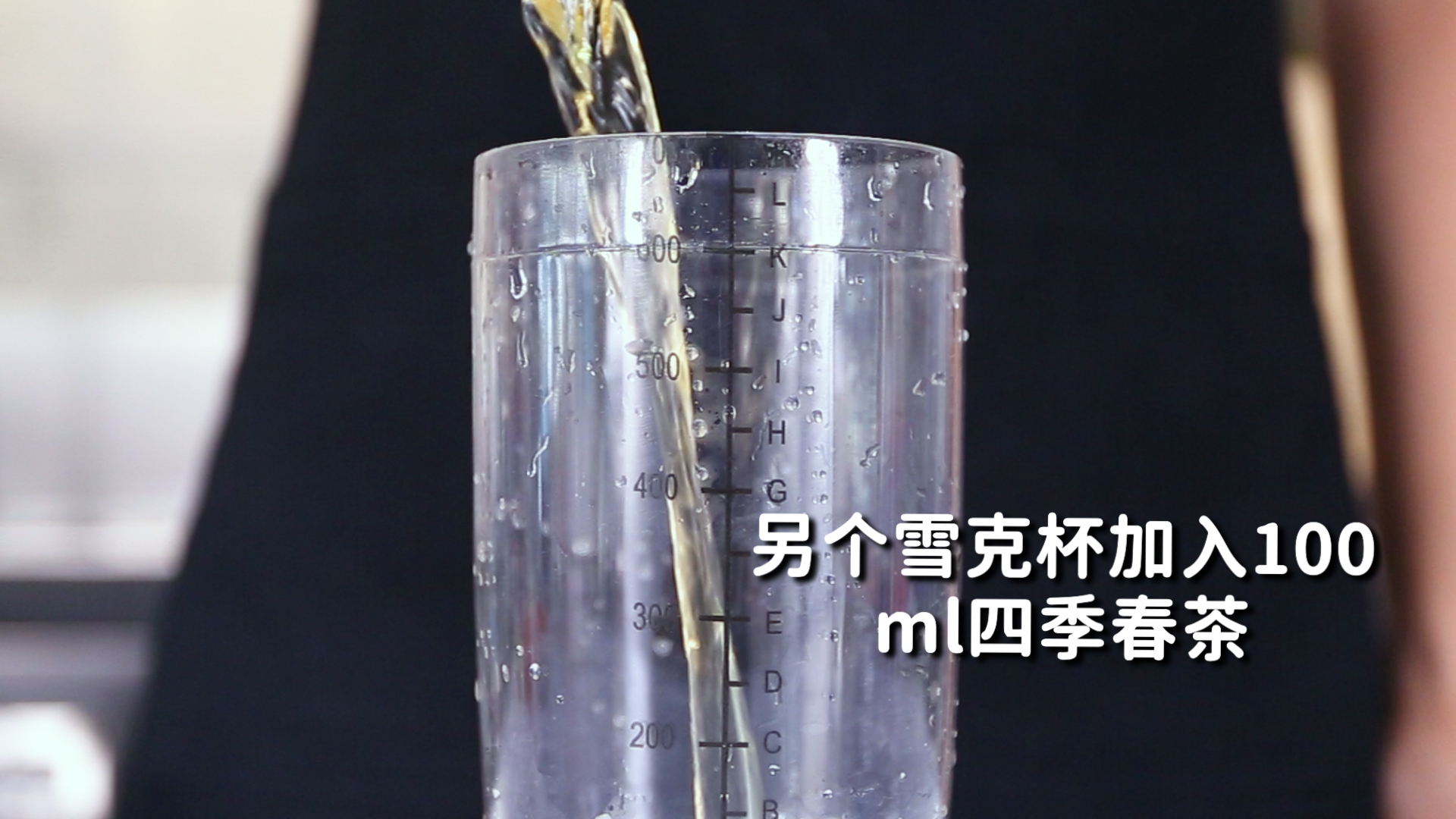 第2步:接着在另个雪克杯中加入100ml四季春茶汤、25ml黄金果糖、50ml蜜桃原浆、50ml调好的奶液,用吧更勺搅拌均匀