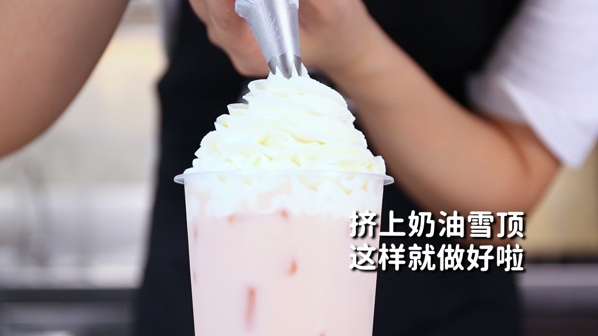 第5步:最后挤上奶油雪顶,加上水蜜桃果肉丁装饰,这款饮品就做好啦