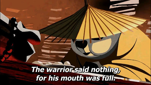 让我们回到《功夫熊猫》:影片以一则2D动画拉开序幕,动画中有一位功夫大侠身披斗篷云游四方,寻找自己的对手。一路上行侠仗义、所到之处均有其英雄事迹。这一段动画是阿宝的梦境,民乐的演奏和,竹笛更带来了一种侠客行迹江湖的氛围感。