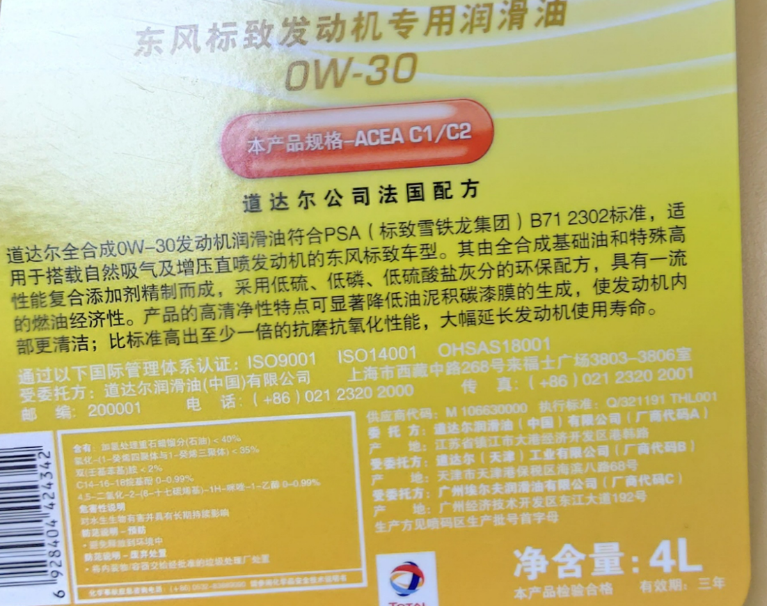 这次保养的的标致全新4008使用的是一台1.8T的发动机,4S店提供了两种机油选择。一种是中石化定制的全合成机油,一种是道达尔定制的全合成机油。两款都为原厂机油,级别为SN级,属于全合成机油。