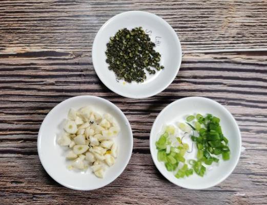第四步,冷锅热油,等油热至2成的时候放入花椒粒,调小火把花椒粒慢慢炒香,炒出花椒油捞出花椒粒,锅里留底油,然后放入刚才切好的辣椒丝和大蒜葱花一起调大火翻炒。