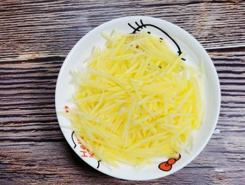 第一步,先把土豆去皮切成丝,切得越细越好,这样不仅很容易熟而且很容易入味,然后把切好的土豆丝放入水里浸泡一下,泡掉土豆丝表皮的淀粉,最关键的一步来了,就是在浸泡土豆丝的时候放点食醋和食盐一起浸泡,用香醋浸泡的土豆丝非常的清脆爽口,而且炒的时候不粘锅,浸泡的时间大约25分钟左右,然后把泡好的土豆丝在用清水冲洗一遍,然后沥干水分装盘备用。