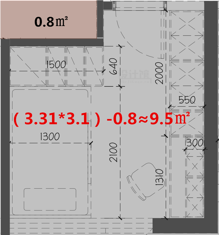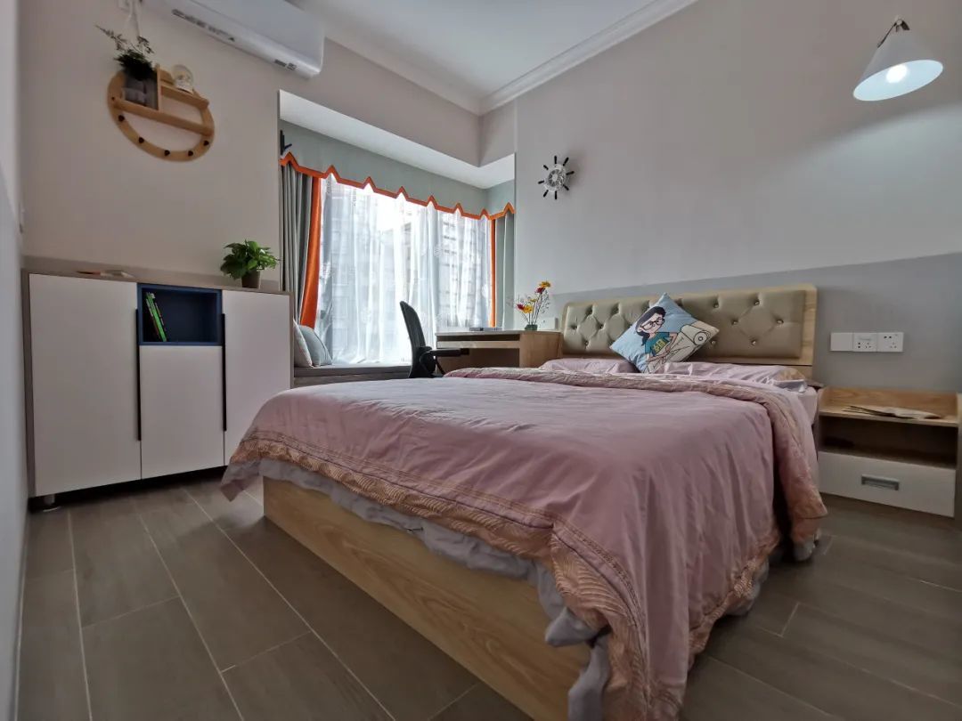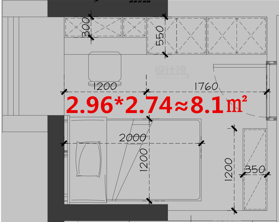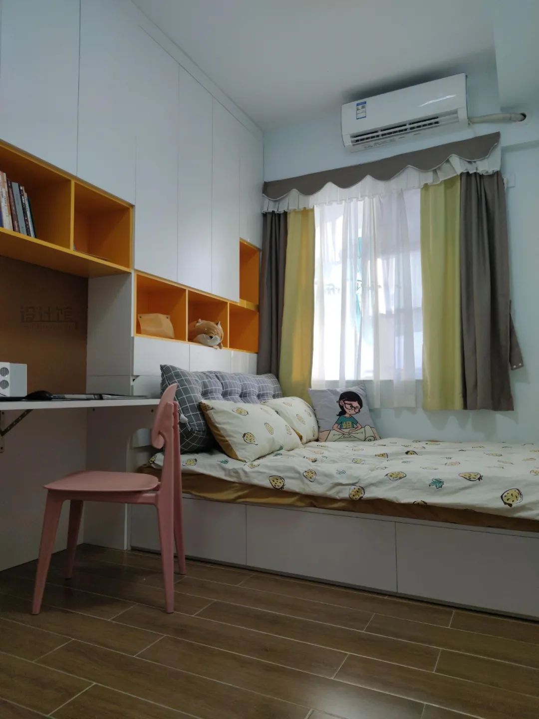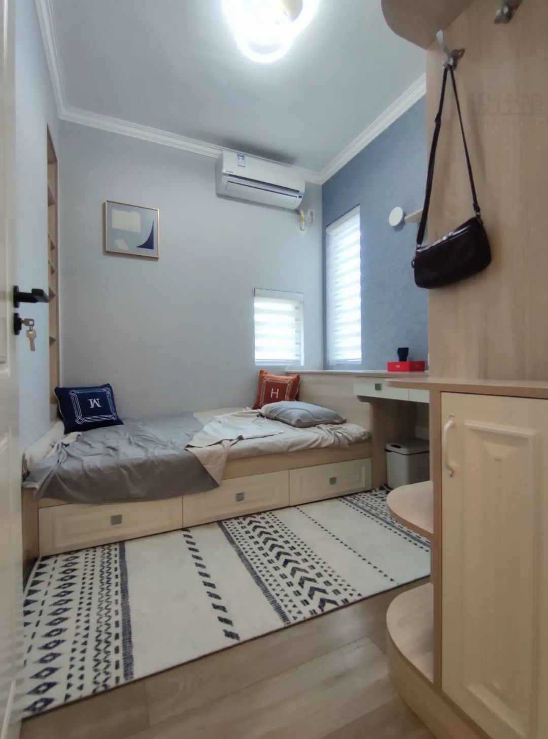 第二个案例的面积大概8.1平方米,这个卧室采取床铺靠墙摆放的方式,进门左侧是床铺+斗柜,右侧是一排衣柜+书桌组合,整体空间利用到位,实用而又宽松。