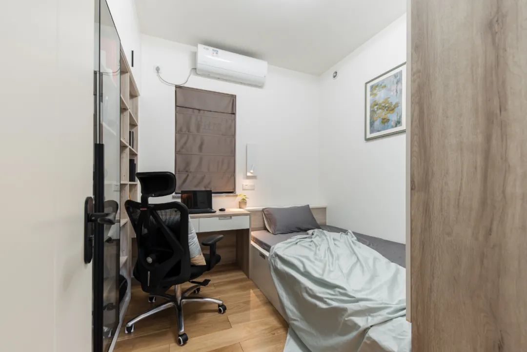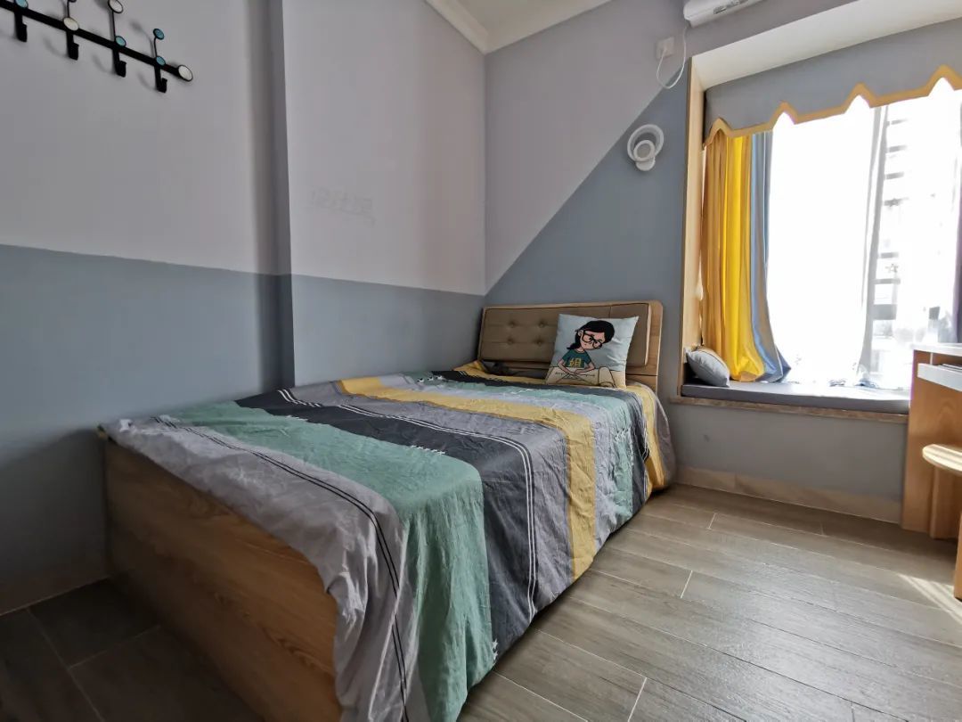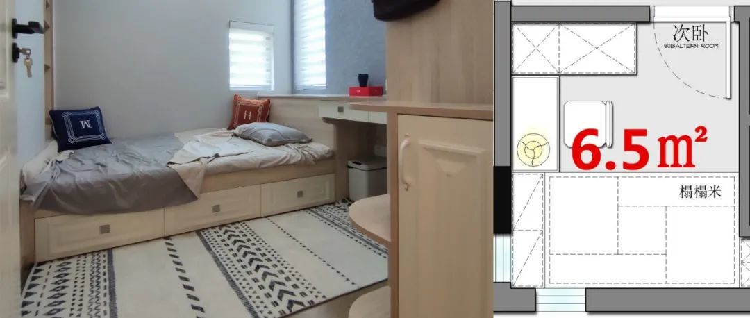 第一个案例的面积大概是6.5平方米,这个卧室是以定制榻榻米床的设计,在里侧定制榻榻米床,靠门口位置设置衣柜,衣柜与床之间增设书桌,整体空间面积不大,但是进入卧室后,却不会感受到任何拥挤的感觉。
