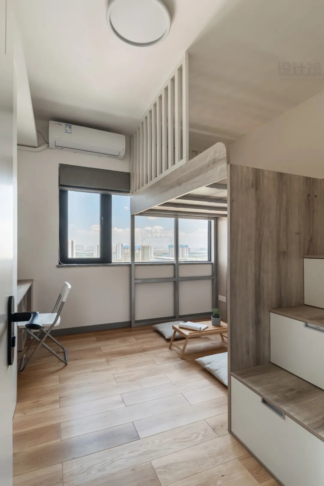 第二个案例的面积大概7.5平方米,这个卧室设计方案是采取高架床的设计,进门左侧装了一排衣柜+书桌组合,右侧是高架床+抽屉楼梯组合,整体设计实用舒适;而床下挑空的位置,则是可以布置书桌或成为孩子的玩耍区,有点大学宿舍的设计味了。