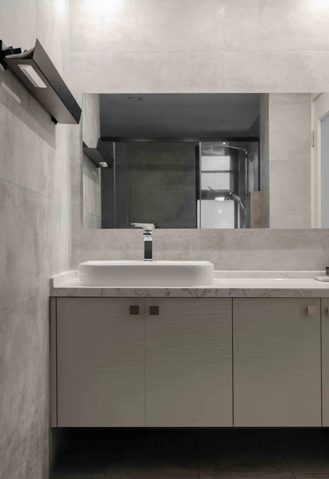 ▲卫生间在仿古灰色地砖与墙砖的空间基础,定制一个灰色洗手盆柜,装上雅白的洗手台+台上盆设计,墙面上挂着一面大镜子,整个卫浴空间简约实用而优雅美观。