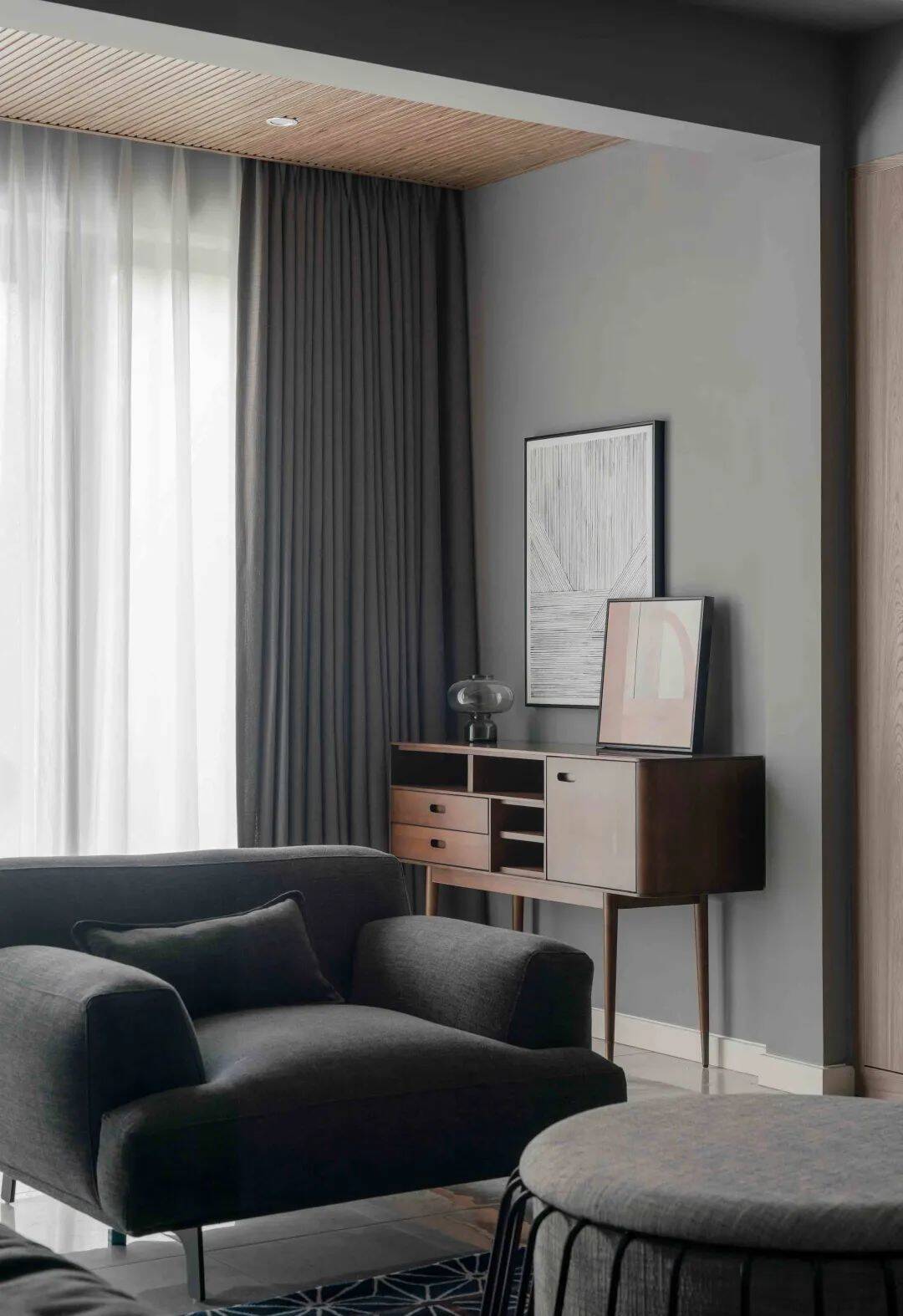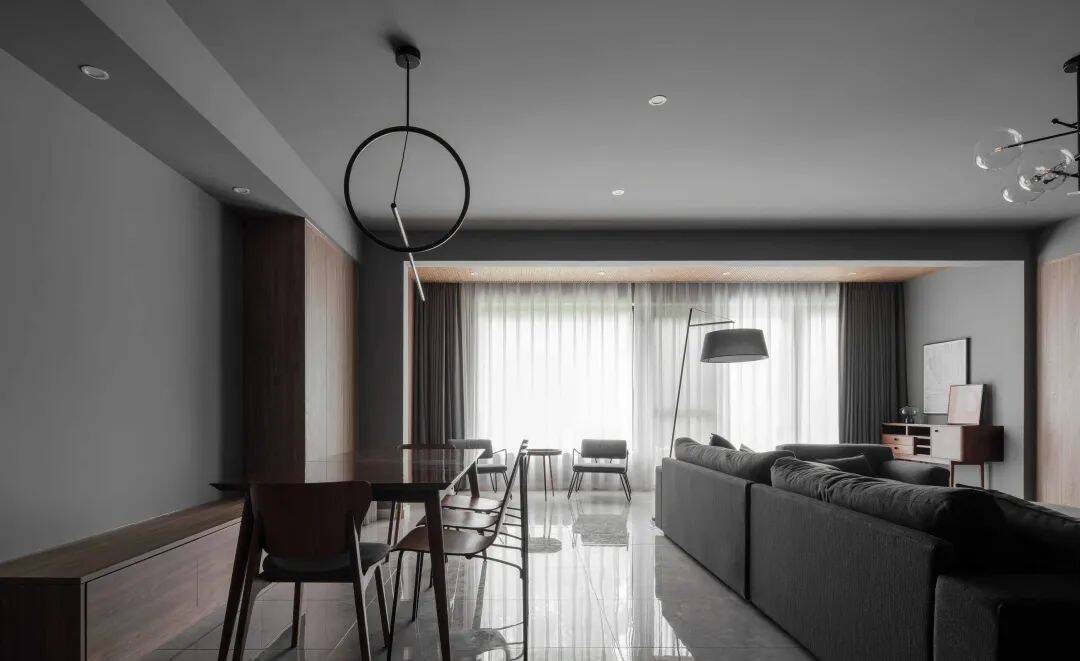 在这套191平米的房子中,整体空间以高级灰的色调基础,大胆地把灰色刷到天花板上,布置以简约舒适的家具,通过渐变色的软装布置搭配,营造出一种独特高级的北欧与简约空间氛围感,让生活空间显得自然舒适而从容惬意。