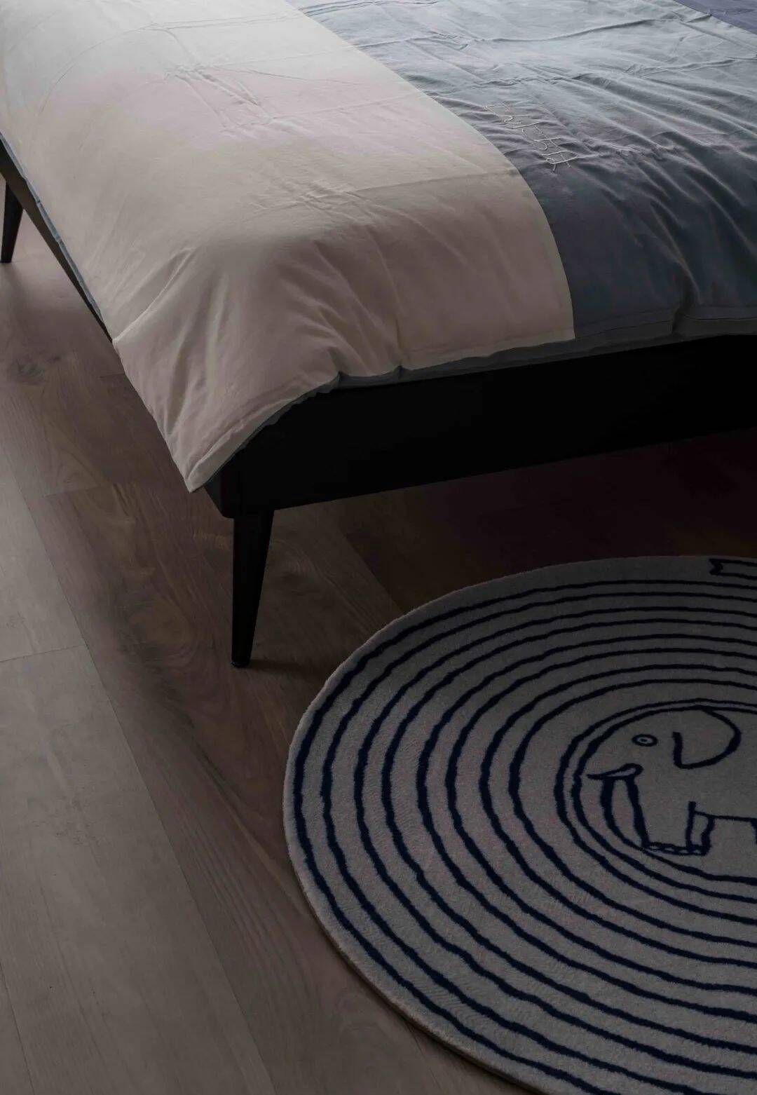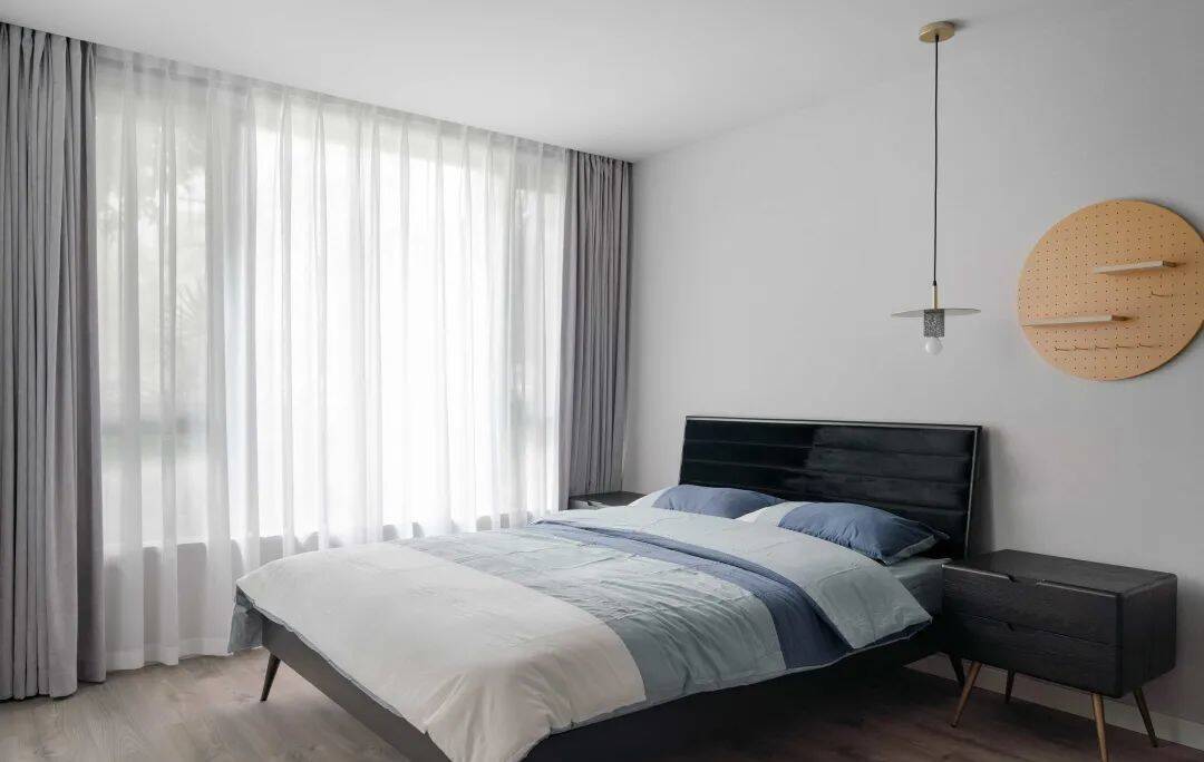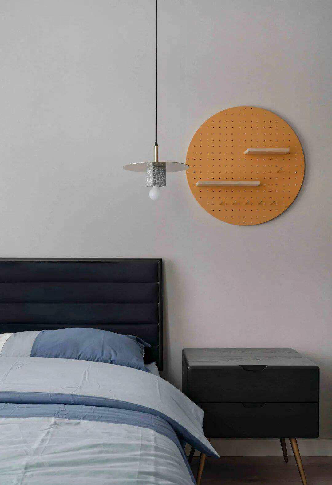 ▲父母房在浅灰色的墙面空间基础,布置以黑色皮艺靠背的床铺,旁边一个黑色实木床头柜,上方一个浅木色的圆形洞洞板收纳架,深蓝-浅蓝-白色过渡色的床单布置,结合浅灰色的窗帘,也呈现出一种安静舒适的从容空间感。