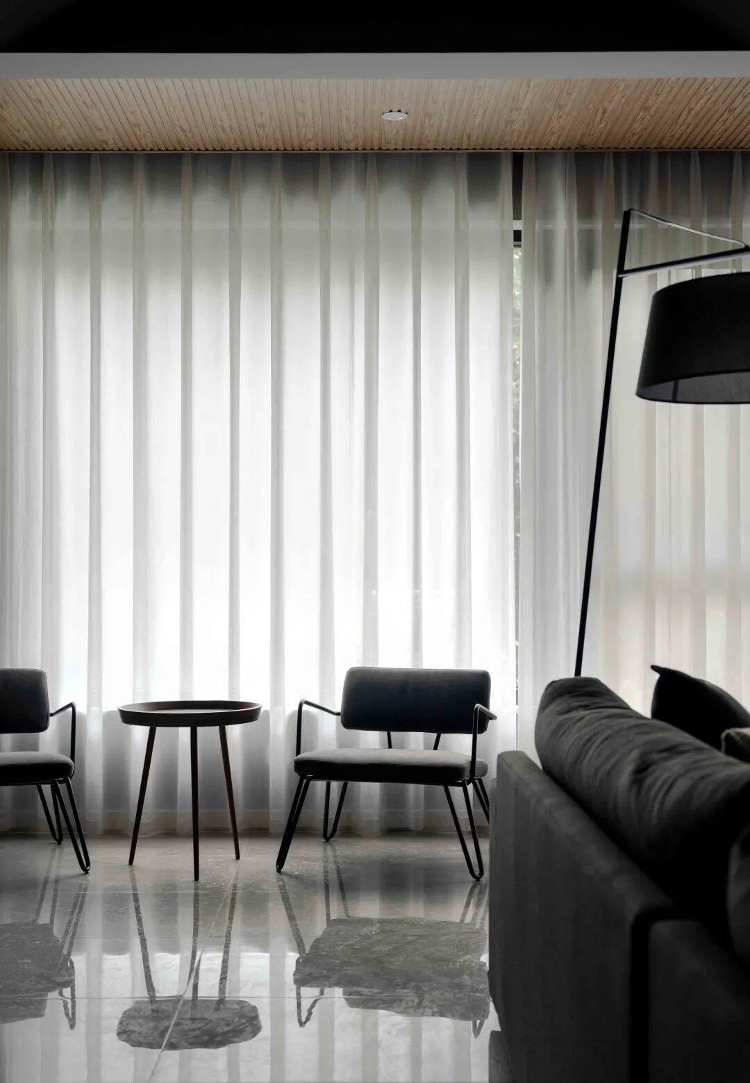 ▲打通的阳台装上灰色窗帘+白色纱帘,布置一套休闲椅与小茶几组合,也让空间显得更加轻松幽闲而舒适。