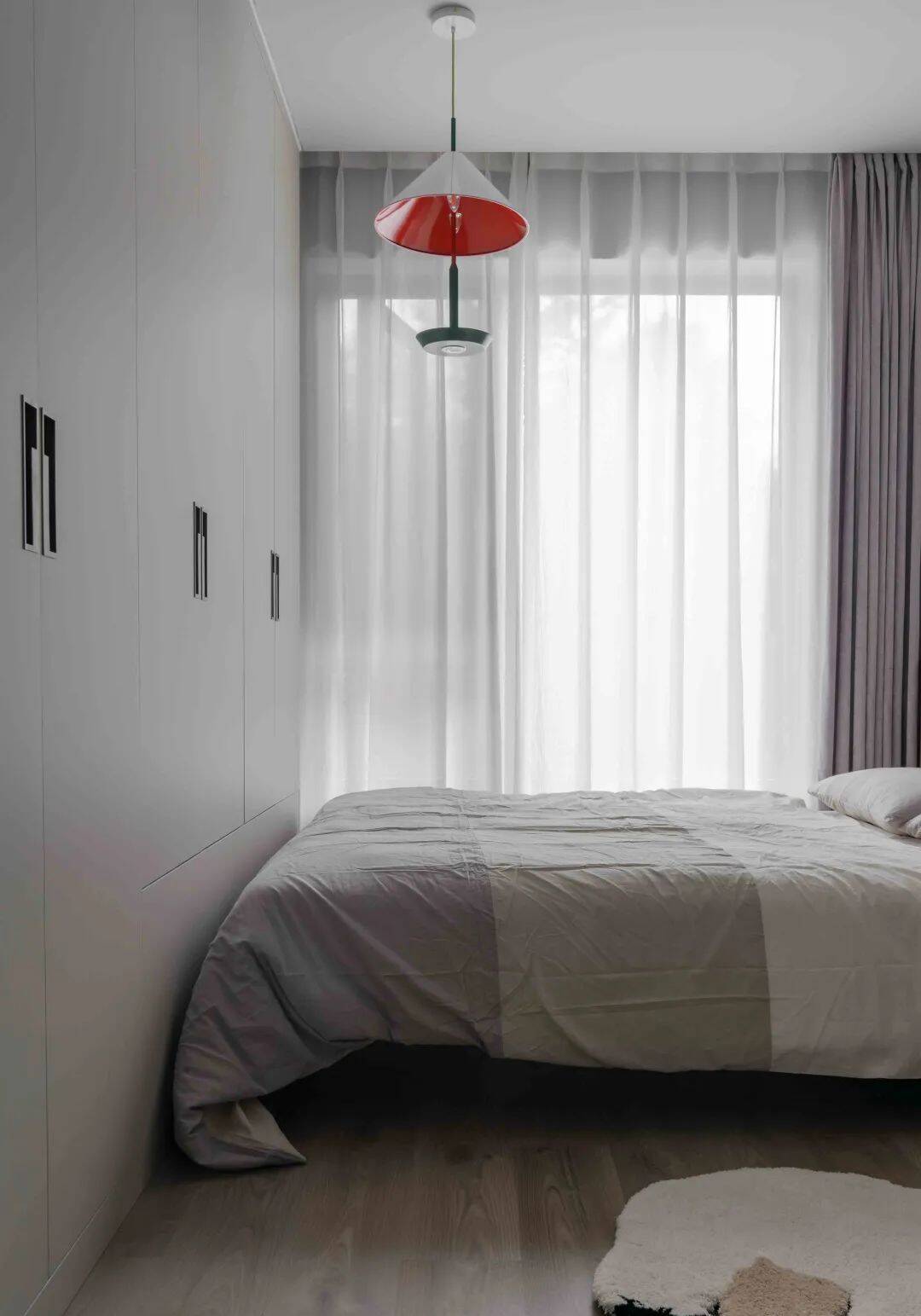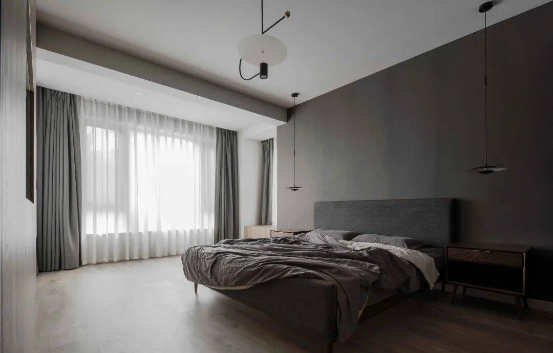 ▲灰色床头墙布置灰色床、床单与窗帘,整个灰色调的空间显得更加简约高级而舒适大方。