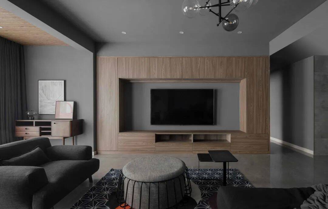 ▲客厅以灰色的地砖,墙面与天花也是刷上灰色乳胶漆,整个空间充满简约高级的灰色调。电视墙以原木色的定制电视柜设计,旁边的阳台也是打通纳入客厅,布置简约舒适的布艺灰色沙发,整个空间显得格外的大方优雅。