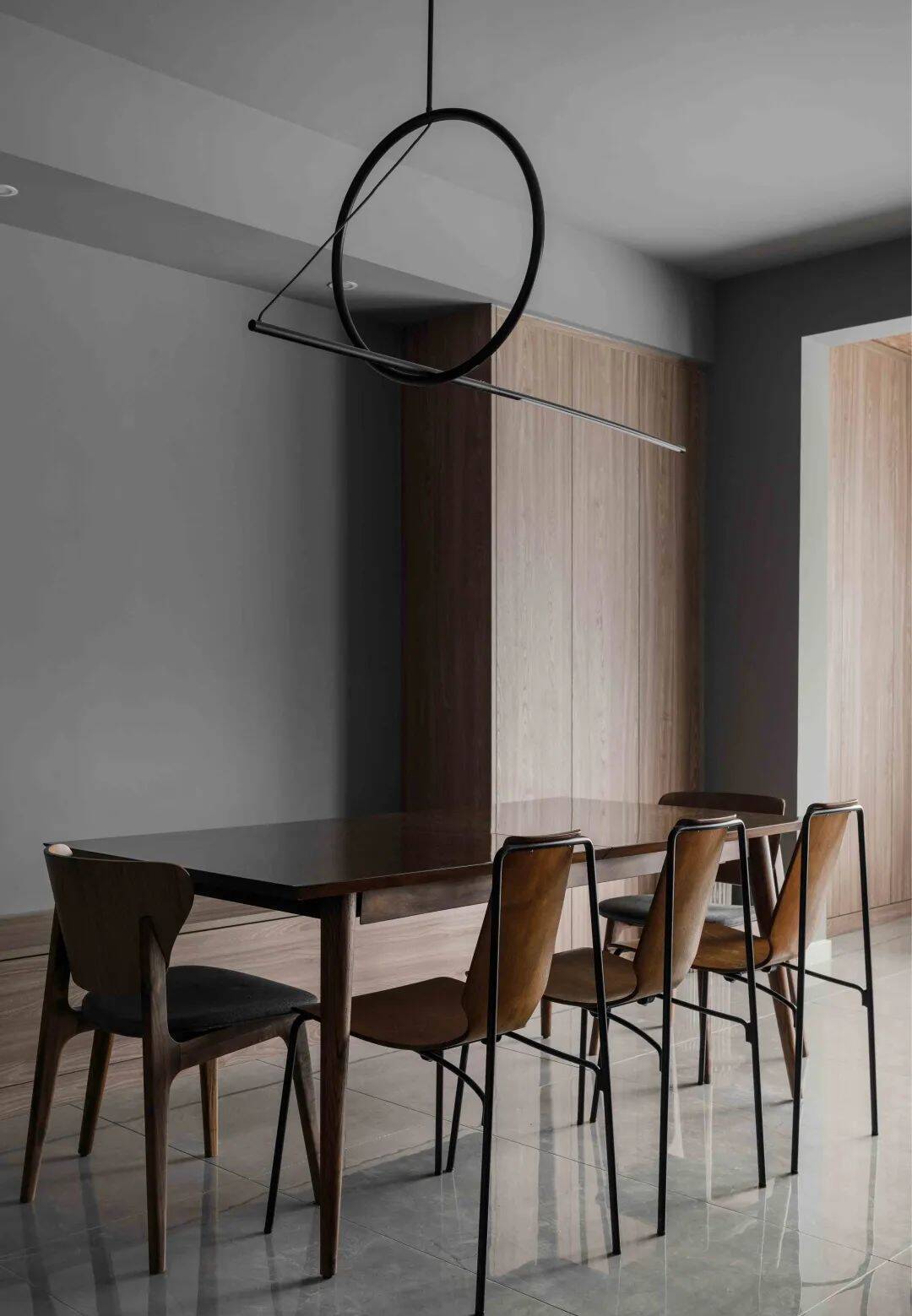 ▲餐厅布置一张实木餐桌,搭配铁艺架的焦糖色皮艺坐垫餐椅,上方一盏极简的吊灯,让空间充满简约高级的空间氛围感。